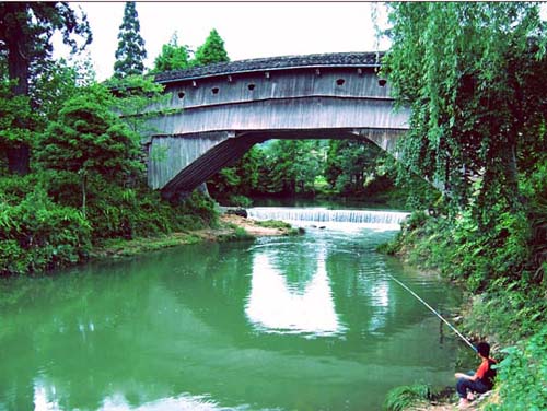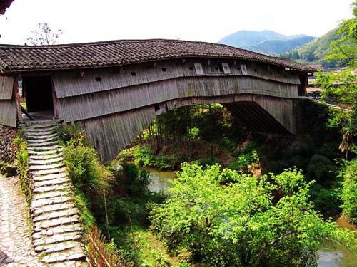 岭下乡广福桥又名溪源桥,位于岭下村村北,东南—西北走向,据文字记载,该桥始建于元代元统元年(1333),清嘉庆十二年(1806)重修,解放后又经过三次维修,是屏南众多木拱桥中维护较好的一座木拱廊桥。桥长32.5米,宽4.8米,单孔跨度26米,桥面距水面高度10.5米。桥屋建11间48柱,双坡顶,屋中梁为重梁(双梁),以木梁代碑,有四根梁柱当碑柱,记载建桥过程及捐款人姓名。桥面于1995年铺水泥路,中设神龛,祀观音、五显灵官大帝。桥堍为毛石砌筑,桥两岸竹木葱茏,桥下碧波荡漾,风景秀丽。2005年公布为省级文物保护单位。桥东端有碑记一通,记载着嘉庆年间修桥的捐款人姓名与金额。桥两端各有左右两条二十多级的石阶。 |