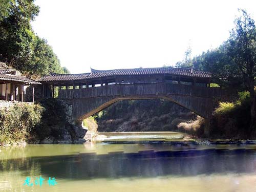 白水洋鸳鸯溪旅游网消息 龙津桥又名玉锁桥、溪尾桥,位于屏南县屏城乡后垅村水尾。桥为东西走向,始建于清初,道光二十七年(1847年)由董事张芳等募建,为本县至今保护尚好的折线型木拱廊桥之一。桥长33.5米,宽4.5米,单孔跨度23米,桥面至水面高度12米。桥堍以块石砌筑,桥面以木板横铺,上以卵石铺砌。桥屋建13开间56柱,九檩穿斗式构架,悬山顶。桥东有碑记和夫人庙,神龛座南,祀五显大帝。建桥主绳为吴高禄,副绳为吴日长;书梁为庠生张辉光,信士张朝辉、张邦昌;克择阴阳为张国柜、僧上章。桥两岸树木成荫,环境幽静,两端各有一株油杉。桥中有一楹联,曰:水色山光不负祗般来往,车尘马迹任随那等奔波。拔贡张宗铭撰后垅八景诗之“桥锁龙津”: 吾乡四面皆山,而玉屏与文笔两山接连,龙紧履是地者,几不知水从何处出也,道光丁未建一桥于岸口,名曰龙津,而九曲水即由是盘旋而出,几有欲往而返之,形桥下潭水悠悠、游鱼出没即作濠上观可尔。