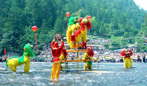 唐宋以来,屏南先祖自中原秦关黄淮地区南迁入屏,为了缅怀故土、祭膜宗先,弘扬家风、贺庆丰年、祈求平安,凡重大节日、祭祀庆典活动,均有舞狮活动。双溪狮类似北方狮子,具有头大体长、身膘腿壮尾粗之特点。狮身用染织的萱麻披盖为毛,狮头用百花点缀,形态威猛至极。舞狮队由三人组成,一人执狮球,一人扛狮头,一人扛狮身。前有松明火把引道,镲、钹、锣、鼓伴奏。随着高亢、低沉的音乐节奏,狮球上下左右随乐而舞,狮子时而俯地谛听,时而蹦腾吼啸。狮子三进后退后,抢扑狮球,尔后把狮球扑吞入口。这时,观众的呼喊声、震耳欲聋的鞭炮声、鼓乐声,把舞狮等庆典活动推向高潮。 |