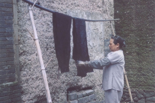 真是无巧不成书。就在我到了双溪打听染坊在哪里的时候,正好遇到一位手提一只大鼓鼓编织袋的乡下大嫂,在街上拖长声喊人,“贵香姨……染布啰……”,“来啰……”,在远处,同样拖长声应答的是一位上了年纪的妇女,她,正是古镇上唯一的染坊业主,姓李叫贵香。她手推着一轮满载货物的三轮车朝我们缓缓地走来。那位手提编织袋的乡下大嫂说,她女儿定在元旦出嫁,编织袋里装的是要染色的细麻布,染成后给女儿做陪嫁。