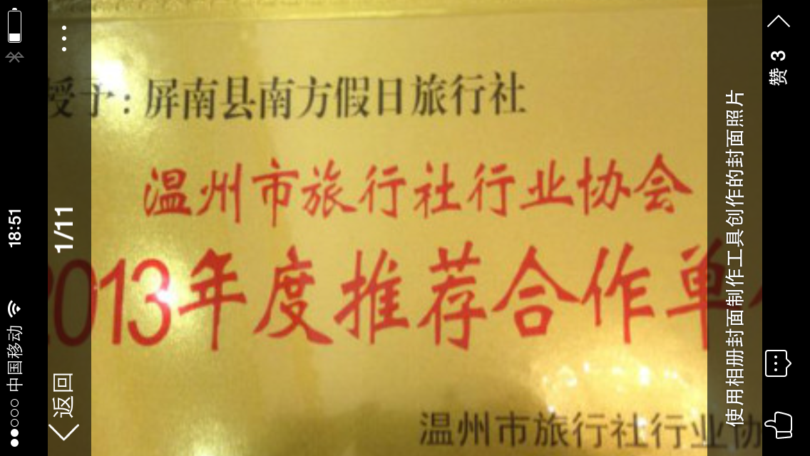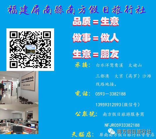 屏南县南方假日旅行社是经福建省旅游局批准、工商部门依法注册的国内旅行社,具有独立的法人资格,专门从事组织个人、团体到国内各地旅游,商务考察,接待全国各地团体、散客来屏南及周边各名胜风景区游览观光,承办各种会议;代购机、车票务。为游客提供“食、宿、行、游、娱、购”一条龙综合服务。我们的宗旨:“诚信经营".以优质的服务接待广大游客。 许可证号:L-FJ-GN90078