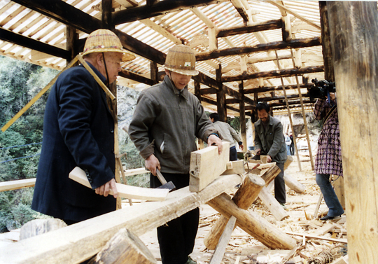 黄春财师傅喜欢看报看电视,他说,这几年,新闻媒体对木拱廊桥作了大量的宣传报道,古廊桥的价值逐渐被世人所认识,其造桥技艺也得到当地政府的高度重视,闽浙两省正准备联手申报世界文化遗产,他感到很开心,目前,他已把造桥技艺全部传授给两个儿子。采访结束时,黄师傅还特地把正在桥屋盖瓦片的两个儿子叫下来与我们认识。他希望有更多的机会建造更多的廊桥,使木拱廊桥工艺发扬光大,代代相传。