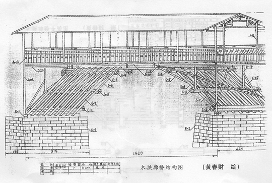 “真想不到,我还有机会造桥。”年届古稀之年的黄春财,身板子硬朗,声音洪亮,看上去只有50出头。“廊桥结构比较复杂。”他一边说一边从工具箱里取出两张木拱廊桥结构图,指划着给我们介绍:木拱廊桥因桥上建有桥屋,能遮风挡雨,俗称“厝桥”。各地木拱廊桥虽然形状有所差别,但木拱结构基本一致,都是用61根大圆木作为纵梁,与10根横串梁木(俗称牛头)以榫卯结构架成“八”字形桥拱,再用8根梁木组成4个“×”字形剪刀叉来稳定桥身,并在桥拱上穿插杆条组成拱架,上方横铺木板为桥面。然后在桥面上再盖以4柱9檩穿斗式构架的桥屋。整座桥不要寸钉片铁,只凭椽靠椽,桁嵌桁,衔接严密,结构稳固。木拱廊桥比石拱桥省工省料,是旧时山区最常见的桥梁。