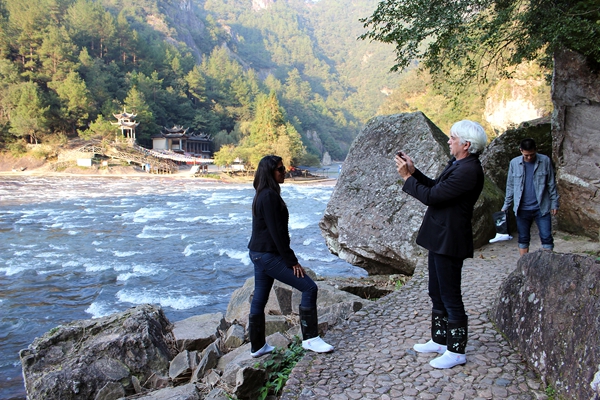晴美秋阳洒在白水洋上,洋面波光潋滟,一片白炽。两岸峰峦叠障,灵山秀水交叠辉映,美不胜收。三三两两的游客时而涉水其上,时而携游岸边。专家们也涉水驻足,流连拍照。英国里维耶拉世界地质公园代表崔茜·伊万·卡巴艾克女士,不顾秋水已凉,谢绝工作人员备好的雨靴,脱鞋穿祙,执意与翻译携手相扶横涉白水洋,向浅水广场对岸进发。导游小张在边上提示:“白水洋貌似平坦,实则‘浅滩暗礁’散布其间。不过俗话说湿透全身,幸福一生!在这里滑倒也是幸运的。”话音一落,引得大家开怀大笑。