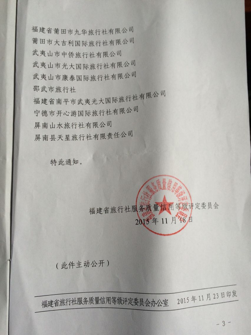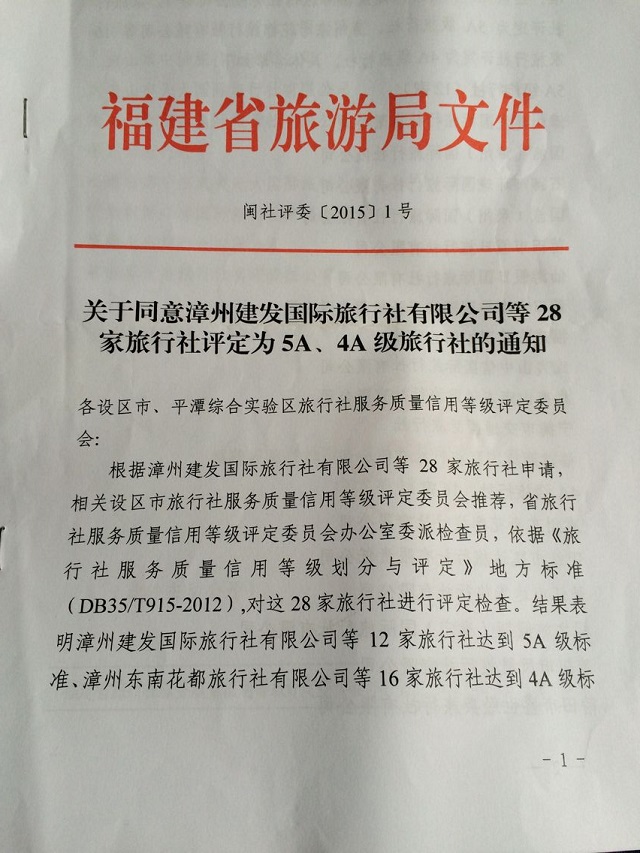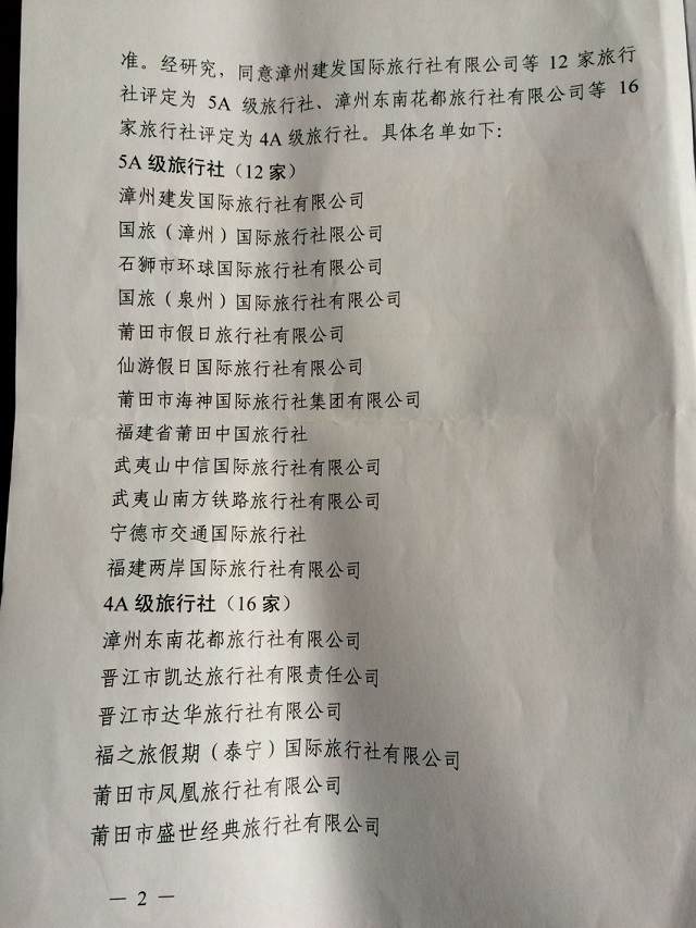 我县山水旅行社等2家旅行社被评定为4A级旅行社