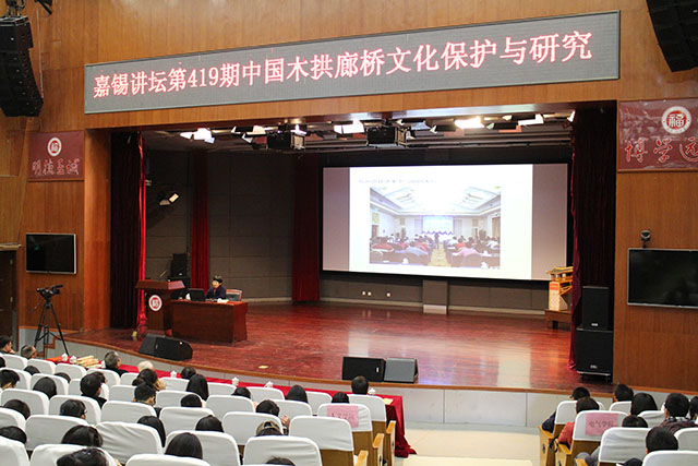 在福州大学图书馆博学厅,来自福大建筑学院、人文学院、电气工程学院的300多名师生听取了周芬芳作《中国木拱廊桥文化保护与发展——申遗工作》专题讲座。讲座前,福州大学党委副书记陈少平亲切接见了周芬芳主席一行,并接受周芬芳主席代表屏南县人民政府向福州大学赠送木拱廊桥模型以及屏南研究木拱廊桥专著资料等。讲座期间,屏南木拱廊桥研究团队还与福大学生开展学术交流互动,得到师生的一致好评。讲座结束后,陈少平副书记还带领周芬芳主席一行参观福州大学校园及多个先进教学、科研实验室,并与我县商讨建立福州大学学生教学实践基地等相关事宜。