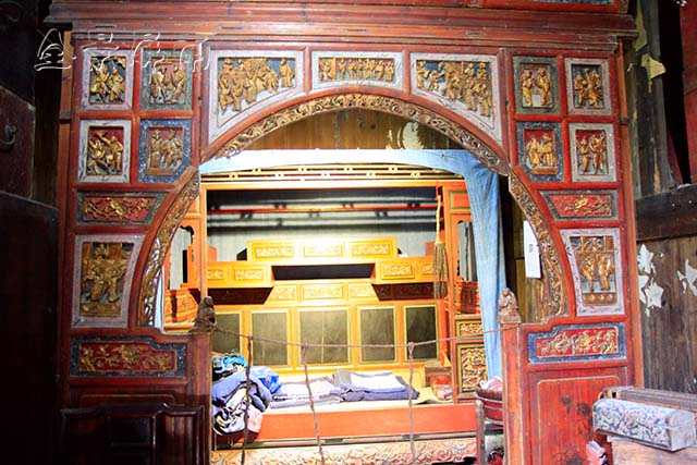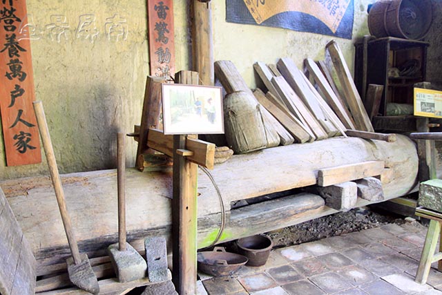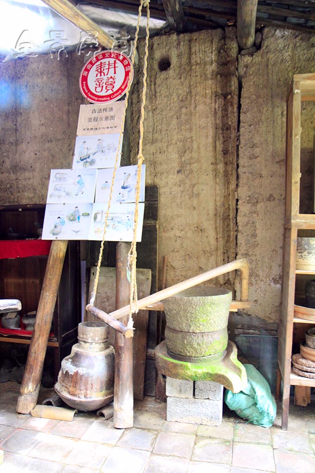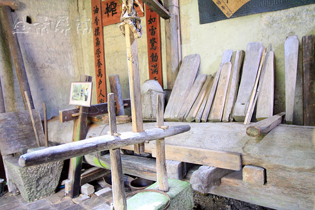 “屏南好漈头”,不是仅仅因为漈头山川灵秀、人才辈出,更重要的在于漈头有老张搞起来的这间颇具规模的民间博物馆,这要重重写上一笔,这在中国其它的美丽乡村是见不到的!哪怕名播遐迩的三坊七巷,被称誉为文化积淀蕴藏丰厚的明清博物馆,也没有屯集到如此壮观的农耕时代的古旧杂物。难怪老张的耕读文化博物馆被称为“民间故宫”。漈头村是座千年古村落,在老张心血筑就的绵延十多座古民居中的“屏南耕读文化博物馆”,与其它博物馆不同的一大特色在“农耕文化体验馆”里,特别是留存着一个千年历史的传统木榨油坊,这也许是漈头村最后一个木榨油坊,可以看作是中国农村手工制作工艺的一个缩影:卧式楔子榨油机,在榨膛中装好油饼后,在油饼的一侧塞进木块,然后利用吊着的撞杆撞击木块之间的一个三角形楔块。随着楔块被打入榨膛,榨膛中横放的木块会对油饼产生挤压的力量。正因为这种三角形的楔块在榨油的过程中具有重要作用,这种榨油机才被称为楔式榨油机。这台榨油机是六年前老张从相邻的漈下村淘来的。老张的榨油机体验馆墙上挂着榨油流程图,边上还摆放了油菜籽、芝麻等油料作物饼,还有灶台、碾盘、一根硕大的榨槽木和一个悬空的油锤。这个榨槽木是用一截椴木造成的,据当地的作家禾源描述说:“横躺在耕读博物馆油坊里的椴木,想象得出,站立时它的霸气,独木成林,遮天蔽日,倒下一刻轰鸣山谷,震动山梁,压碎四周草木。这样一棵占尽一片天地的大树,它万万没想到自己不能寿寝正终,而是被锯斧伐倒。几十条汉子,如同蚂蚁搬虫,把它扛回村子,抬到榨油坊,成了油行,大树的其余部分有的成了油行楔子,有的成了柴薪。一路号子,如同为大树迁魂村庄的古咒,一路汗息,又如敬天香火的气息。椴木静静躺着,岁月的年轮就此凝固,它的生命意义开始转变。木心掏空,装下榛树、茶树结下果子制成的油饼,一枚枚木楔楔入,重重的石锤重击楔子,榨出叮叮咚咚的油汁滴下的声响。”禾源兄描绘的这样场景依然在耕读博物馆里再现,说是“体验馆”一点都不浮夸,老张和今年七十三岁高龄的榨油师傅张龙门这六年间已经在这里榨过了九轮油,每回榨油都招来村民帮助和围观,像过节一样。一天可以榨出几十斤油,每斤可以卖100元以上价钱。坊里摞起来的的油茶饼不是淘来的,是老张亲手榨出来的。老张说,木榨榨油从筛籽、车籽、炒籽、磨粉、蒸粉、踩饼、上榨、插楔、撞榨到接油有十多道工序,除炒籽、磨粉是用机械操作外,其他全部靠手工完成。用木槌榨油是木榨油工序中劳动强度最大的,没有一定的力量和技术,那是甩不起来的,这道工序对木榨师傅的身体素质要求极高。榨油的木槌是根4至5米长,直径为5至6寸粗的檀木,重量大约在80公斤左右。木槌的前端用铁包好,再用一根粗绳栓紧木槌的中部,绳子的另一头栓在空中的木柱上,木槌离地面大约在80公分左右,便于榨油师傅在操作时,用双手推着80公斤左右重的木槌,一槌一槌将木楔子打进去,把油给榨挤出来。