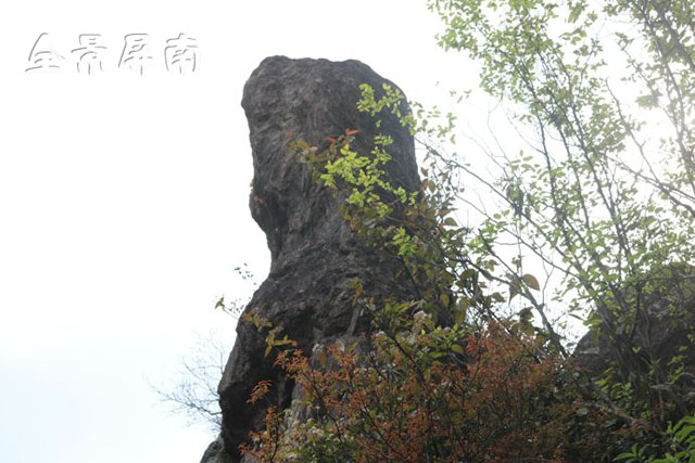 蝙蝠洞周边,奇花异石,古树倚壁,蔓草横生。卧女仰起的头颅,正对一块岩石,恰如梳妆镜。转过山崖,枝叶间见一巨岩挺立,别有一番景致。初看像浣熊,再细看,头上绿树如冠,草如鬃毛,在脖颈间随风起伏。造化天工本来听凭天马行空的想象。当爬到卧女“胸部”后,我才真正体会到“海阔天空”“天人合一”的含义。卧女胸部是巉岩峭壁,青苔爬满崖壁,巨岩悬空,恰似卧女嘴里含着一颗松动的乳牙,竟让我们走得胆战心惊。一尊狮子头岩石,悬于峭壁之上,底下的身子与头之间,不知根据什么力学原理予以支撑,千万年来,始终没有滚落下去。这雄狮仰面呐喊,令群山臣服。当我坐在狮子身上,感觉格外渺小。我们找了一处较平坦的岩石歇息,只见前面有一金龟石,其伸出的头和露出的尾,都惟妙惟肖。站在岩石上面,清风飒飒,青山连绵,巍峨辽阔的寿山尽收眼底。
