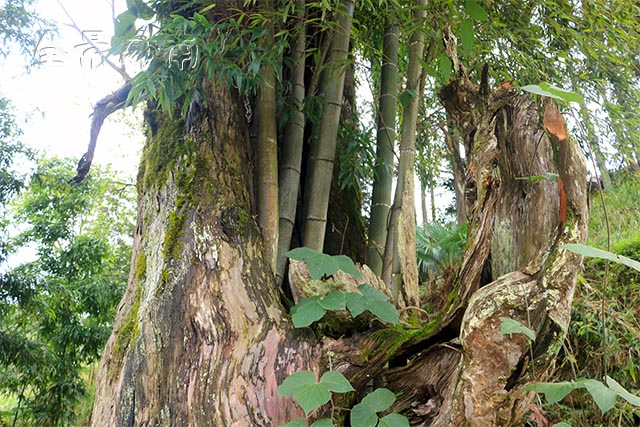 岭头村东边,岩石上长出一株千年红豆杉,树的怀里伸出了19根竹子,真是一大奇景。村里有个喜欢笔墨的村民魏承济,为它写了一首七律《观奇树仙洞有感》,里面有句“胸有成竹名其实”,眼前的奇景就叫“胸有成竹”。