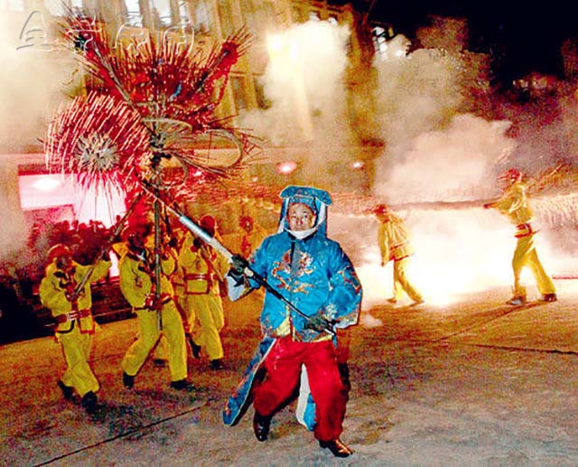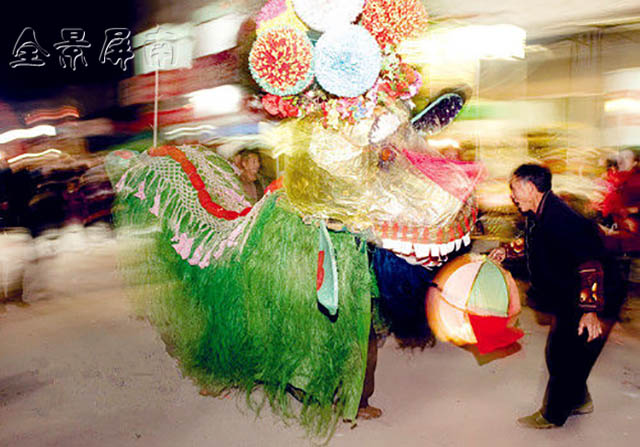 只见一位青年手拿一个用五彩丝线扎成的花绣球,两头高大威猛的狮子随着那只花绣球翩翩起舞。一会儿蹿上、一会儿蹿下,一会儿又向你张开血盆大口,一会儿又向众人低头鞠躬,一会儿又扭动起那笨拙的身姿摇摇摆摆,模样甚是可爱。那五彩的花绣球是指挥棒,那舞球的青壮年就是指挥家,这就是故乡有名的“双狮戏球”。“双狮戏球”后紧跟着一条长长的香线龙,只见那龙身长约几十余米,龙身全用稻草扎成,浑身上下插满点燃的香线,龙身下用坚实的木头捆扎,几十位青壮年扛着,那燃起的香线龙舞动起来全身闪闪发光、清烟缭绕,香气飘散,在黑夜里是一道非常壮观的风景。龙自古以来象征着吉祥、如意、腾飞,家乡人为了来年风调雨顺,来年吉祥平安,来年有个好收成,在每年的元霄节里总少不了这个精彩的节目。
