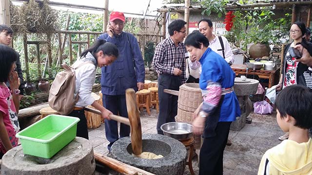 在耕读体验馆里,我吃过许多次的臼头粿。一个不知老家在何方的圆形石臼,偶然间,命运的浪潮把它推到这个篱笆墙内的场馆里,和许多不知从何处而来的客人,就这样,不期然相遇了。当热气腾腾的粳米饭端上来的时候,是想找一份怀想的满足,还是满足一份好奇,一双双手争相举起那把不轻的木槌,不均匀的“呯、呯……”此起彼落,时断时续,大家互相调侃着彼此动作的可笑笨拙,像在表演一出很热闹的喜剧。这样的场景气氛,客人总是兴致盎然。我担心他们的槌子会落到那个埋头给木槌蘸水、为米粿翻身,我们称之为“顾粿”的老人头上,我又担心那渐渐抱团成形的糍粿会被他们带出石臼,落到地上。这样的情景似乎还真出现过一次,那是我在一个南中国的多民族聚居的村落景区里,当一臼的糍粑“扑”一声掉落地上的瞬间,大家惊呼而雀跃,这做为体验性旅游过程的一个花絮,为那次游玩增添了难忘的笑资。