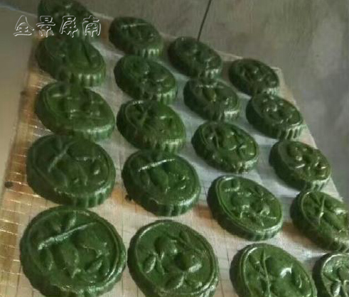 草菊粿是一道野草和米桨一起制作的美味,草菊是一种野草,长在田间,长长尖尖的叶片和柔嫩多汁的枝条上有细细的绒毛,开着黄色的小绒球攒成的花盘。检其嫩芽和花朵,洗净,放到石臼里捣烂,和磨好的米桨混合好,放到油锅里两面翻煎成一块块小饼。油香中透着一种草菊特有的清香。绝对是屏南乡间小吃中的精品。把草浆和米粿打在一起,放在模具里压好,可以让草菊的芳香长久地储存,就可以经过长途旅行,送给远方的亲人。前几天舅妈就带了好多给我,让我饱享了家乡的美味。