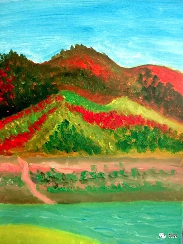 这幅画用了一个小时左右的时间,边聊天边玩边画完成的,也是第一次油画风景写生不知如何画,想起了儿时父亲经常画山水画,于是链接那种熟悉的感觉,开始快乐无拘的按喜好画起来,最后还随意的加上我喜欢的色彩,这种没有任何画理,没有理由的画法,享受其中,快乐最重要