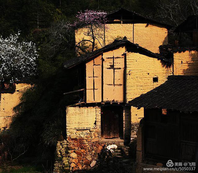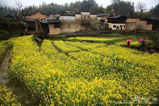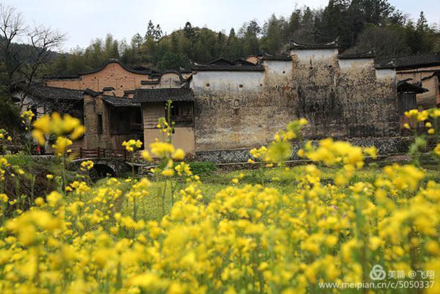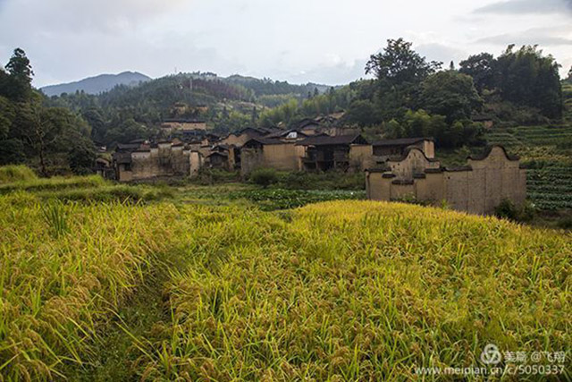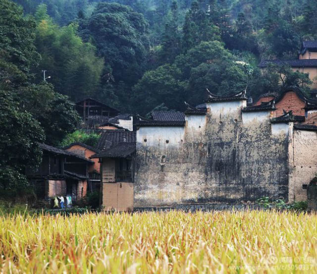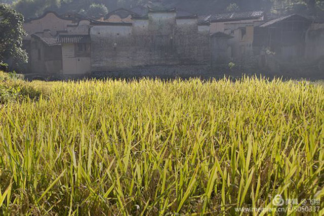 秋季来临时,成熟的金灿灿的稻谷,而成金黄色的稻花,连片成稻海,与古村古墙相辉映,美伦美奂