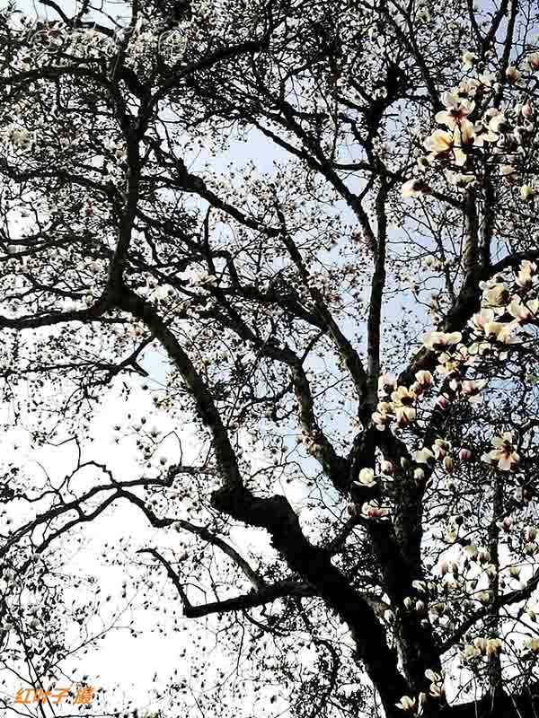 而第二句里的“四树”,说的是巴地的四大名树:江南油杉、红豆杉、柳杉和白玉兰。正月十三那天,原本只想去走走这个村子里的巷道,却无意中遇见一树玉兰花的盛开。我走到花下抬头看,好大一棵树,满树的花朵洁白无瑕。每一朵花都展露着不同的姿态,都自在地拥抱属于它的天空,都无所顾忌地开在阳光下,笑在春风里。没有一片叶子,舍得留在树上干扰它们。阳光很暖,风吹来满满的花香把我包围。比我早到或略迟一些来的人,都是算准了花期来欣赏它或拍摄它。开在早春的玉兰花,是洁白、美丽又高贵的,如果在现代城市的公园或住宅小区看到,或许并不新鲜。但是,那么高大的一棵,开在这小小的村子里,并且迄今已有127年的树龄。玉兰并非能结出可以解馋或卖钱之果实的柿树或梨树,也不是杉木,粗大了可砍下来做实用的家什。那么,那位有心种下它的人,应该是一位心中有美且向往美的风雅之士吧。一个世纪多的风雨里,外面的世界经历了翻天覆地的变化,而它却在这里静静地生长、开花,年复一年。不知那位种花的有心人,有没有想到一百多年后的今天,会有这么多人为它的洁白与芳香而痴迷,反反复复地奔赴他的村庄……