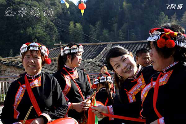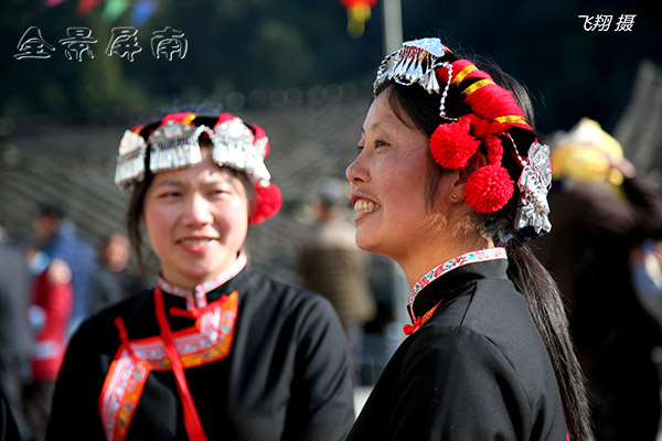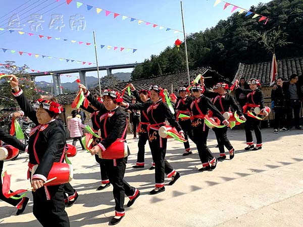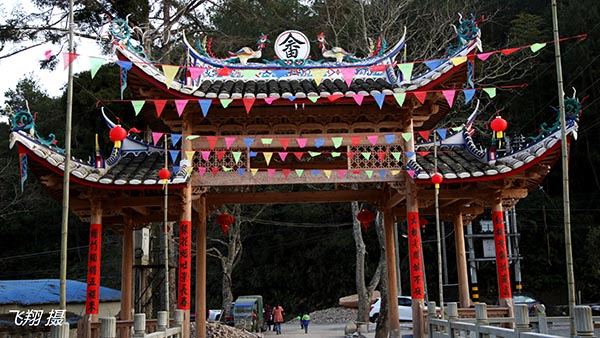 早在电视节目里看过畲族歌舞中盛装出场的女子,但眼前,着一身畲族服饰的巴地女子,依然是一抹令我赞叹的惊艳。布艺考究的黑色衣裙之上,点缀着出彩的红色刺绣,再配上流光溢彩的头饰,仿佛就是当初那个爱唱歌的山哈女子。这些女子中,有嫁到巴地村的畲家媳妇;有已远嫁他乡,却因这个特别的节日而回到巴地的畲家女儿;也有尚在读书或已工作,但还未出嫁的畲家闺女。她们在这身服饰的映衬下,个个都光彩夺目。此时,她们似乎已卸载了平日的种种身份,而作为从凤凰山走出的畲族一个蓝姓分支,绵延至今的一个少数民族的女儿,才是她们今天必需全力以赴的唯一身份。她们盛装的容颜,不仅让人目不转睛地留恋,也让人展开无限遐想。在我看得正出神时,我听到一种歌谣在她们中间被轻轻地哼唱。唱歌的是两个年轻女子,问一下才知道,一个是大学刚毕业在邻县中学教书,另一个则是在外打工专门回来过上元节的。在这个节日的诸多程序中,并没有唱畲歌这个环节,所以显然不是为此专门去临时排练的。对于我的诧异,其中一个解释说,“我奶奶会唱很多畲歌,所以我会一点点。后来在民族中学念书与外地的畲族同学交往时,也悄悄地唱一些。”