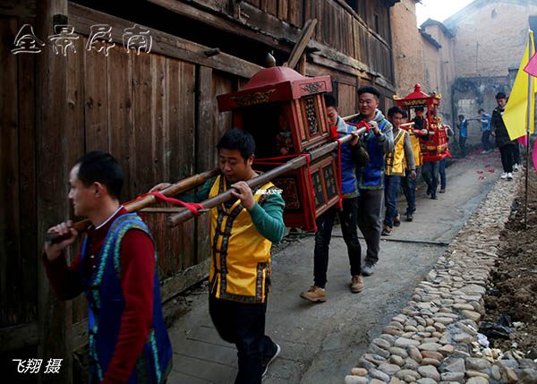 正月十五是巴地的上元节。今年的这一天,我在巴地亲见了一场民族节日的盛典。为这个节日而做的种种准备,巴地人显然操劳了一阵子,可对此,他们不仅心甘情愿,还饱含无限盼望与希冀。这一天的巴地村,比任何时候都热闹,嫁到城里或别村的人、在外工作的人,都携家带口回到村中。社戏、祭神、游神、舞龙,全村人在连续三天的活动中疲劳着,也欢愉着。而我,作为一个外人,也被那份全身心的投入感动着。穿上一身民族服装的大叔,显得特别精神。在屏南唯一畲村里生活的巴地人,平日的服饰早与汉人没有什么区别,但几乎每个人都珍藏着一套畲族的服装。这一天,他们经过一番梳洗后,将它们从箱子里小心翼翼地捧出来,在镜子前穿上且照了又照,然后才去祠堂里叩拜。不善于言辞的大叔,没能向我诉说更多对于先人的敬仰。但我明白,每个民族的祖先都有值得叩拜的理由,所以,我敬重他们对先人那份朝圣般的情怀。