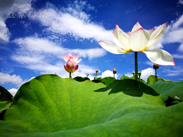都说,荷花因为映日而特别好看,所以我于午时再次奔赴。此刻,天蓝如海,有云朵,但是很轻,也很淡。阳光无遮无拦地照在荷塘上,我担心那些娇贵的花儿会像我一样,无法承受如此烈日。但是,我似乎多虑了。你看,骄阳之下,高出的荷叶被照得脉络分明,照得由碧绿变成嫩黄,黄中又夹杂着绿色的叶脉。而盛开的花朵,则像一盏盏明艳的宝莲灯,亮煞所有痴望的眼。撑一把遮阳伞,在廊上来来回回地走,看湖光澹澹娇荷媚,看粉面嫣然映日盘,看这娇花碧叶映衬着蓝天白云……做一回只为花低头的痴心人。