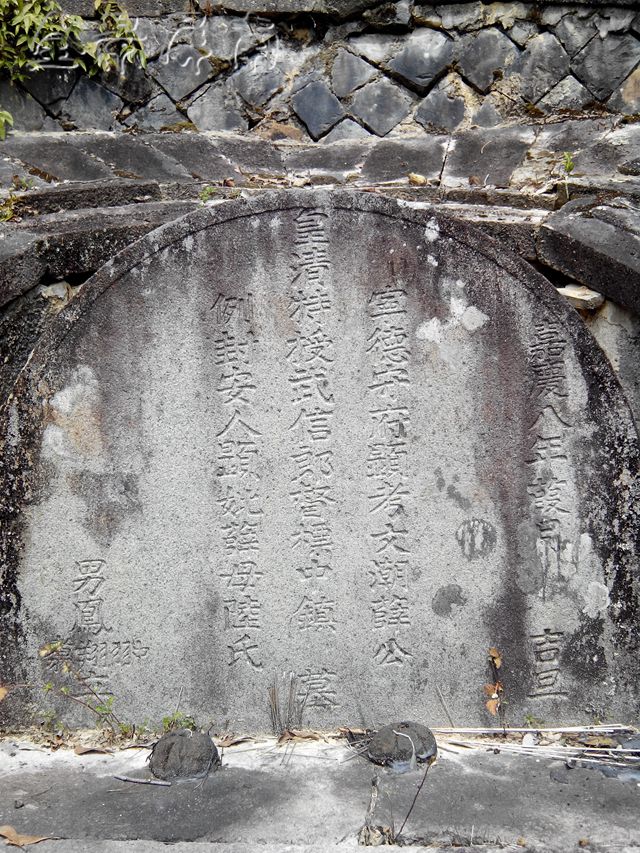 我们不约而同地一阵小跑登上薛公墓。坟墓坐北朝南,背枕坮头龙冈,前临稻田清波,占地面积约260平方米,墓手三层,墓坪两层,墓面用花冈岩块石干砌。坟丘呈龟背形,前设祭台,上立半椭圆形墓碑,正中阴刻“皇清特授武信郎督标中镇之潮公之墓”,墓坪上耸立着两根高5.93米的六角形花冈石望柱。整座坟墓的外观呈“风”字形,如入龙怀,如半月沉江。在那贫穷落后的土地上,在这偏僻幽静的群山中,面对这气势恢弘的坟墓,我仿佛听到了海峡彼岸传来的那一阵急促的马蹄声了。