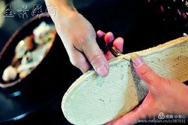 莲花嫂告诉我,千层底鞋的制作,要经过七道工序。且每道工序是环环相扣,要极其认真、谨慎。袼褙,是千层底的第一道工序,即把布一层层粘贴在一起,贴至约1.5毫米,烘干成布板俗称“打袼褙”。袼褙完就开始切底(把袼褙切成一片片的鞋底),切底完就开始包边,每片鞋底用新的白布条包上四边。接着把包边后的鞋底料八、九层粘在一起,粘合后的鞋底用麻绳沿四边缝合,这道工序决定着鞋的式样强度,因而是七道工序中的重要一环。圈底后,接着开始纳底,真正的纳鞋底就是从这里开始,用麻绳缝制鞋底,要求每平方寸鞋底纳81针以上。麻绳粗、针孔细,制作时要用手勒得紧,针码还得分布均匀。做完这六道工序后,最后就是槌底,把纳好的鞋底经热水浸泡及热闷后,用铁锤槌平。槌时要靠模板加工,不能走样。一双千层底就是在这样极其复杂的工序中艰难诞生。