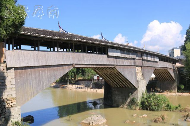 千乘桥原名祥峰桥,名字由笔架山耸峙的双峰而来。千乘桥始建于宋理宗年间,桥南北走向,长62米,宽4.9米,桥面距水面9.7米。四柱九檩抬梁式木架构,桥的顶部是歇山顶。廊屋24间99柱,原先是100根柱,桥头南向台阶边的一根柱子使行人走路不方便,被移去。桥面铺设地板。梁檩上题跋刻有建桥董事、捐款人姓名。