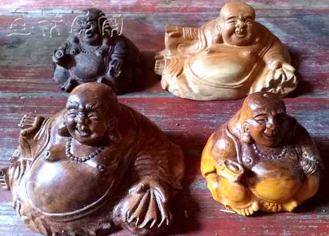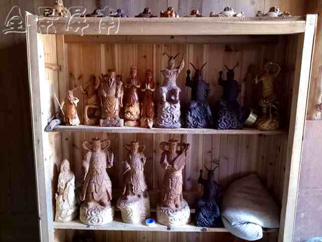 厅堂摆一八仙桌,主人请我就坐、上茶。那茶味道纯正,是芳院自产的。桌子边立着一个花梨木雕刻的弥勒佛,他把如意举在头顶,憨态可掬。我注意到靠墙有一个木柜,里头摆放着几层木雕,有四大天王、孙大圣、观音、关公等神佛像,最上面是一排精美的弥勒佛像,材料用了黑檀木、花梨木、红豆杉等名贵树木,这些工艺品竟然都是主人手工雕刻的。