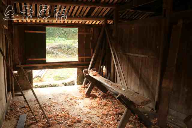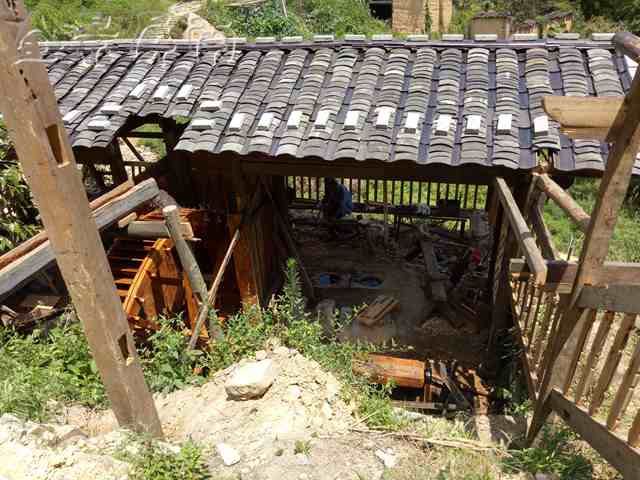 工人告诉我水碓是怎么工作的。一个装有板叶的立式水轮连接转轴,转轴上装有错开的拨板,利用流水冲击使水轮转动,在转轴前面放着碓杆,碓杆的头端装一块圆锥形石头,轴上的拨板拨动碓杆的梢,使碓头一起一落地打在石臼孔里。