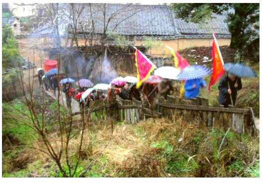 忠洋的重阳节俗,在初九这一天,被推向高潮。这天早上,戏班里已穿戴齐整、化好妆的铁拐李、汉钟离、张果老、何仙姑等八位神仙,恭候于东岳庙外。一阵锣鼓与鞭炮声中,一大捆点燃的线香,被从神像面前的香炉里移到香亭。接着,庙里的主神泰山公,被小心翼翼地请进神轿。又一阵鞭炮与锣鼓声之下,香亭在前、神像随后,八仙护送着泰山公到村里出巡了。巡村的队伍拐进古街,朝村北的墩里走去。北面的墩里陈家,是忠洋村最早的拓主,墩里也就成为忠洋的发祥地。所以,墩里历来是出巡的首站,即使在忠洋村余下的陈、韦两姓中,陈姓只剩四户人家,也一直保持着这个习惯。虽说,这只是一种节俗的传承,对先民的尊重与礼让,也多少可以看出占绝大多数人口的韦家后人的气度与胸怀。
