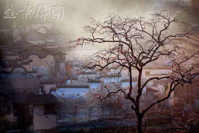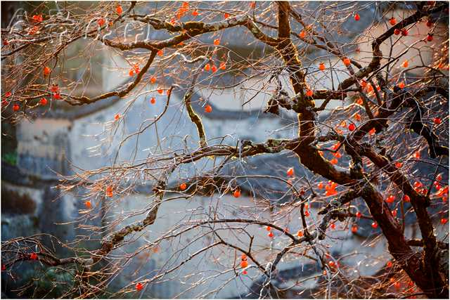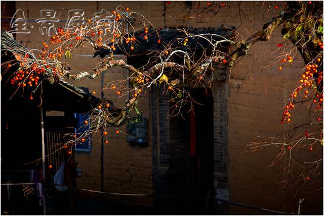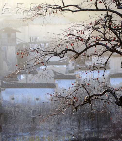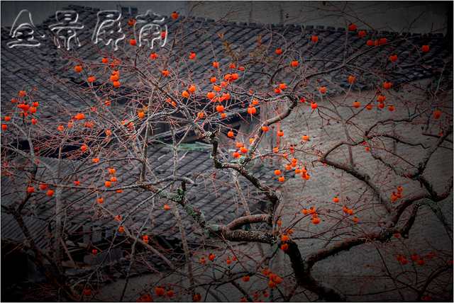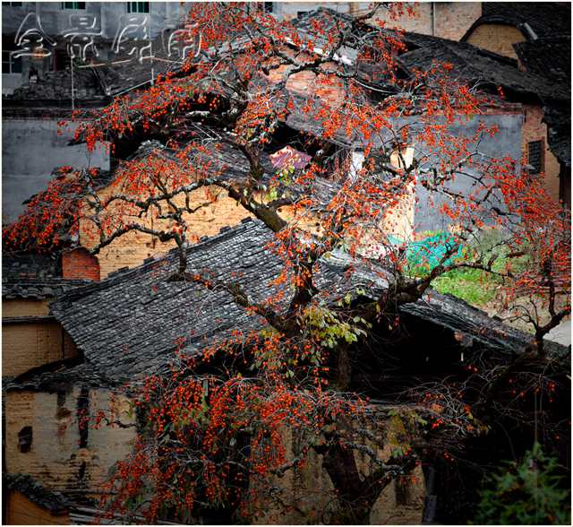我看过本土的一个摄影家的一幅作品。在一片黄墙黑瓦之中,有一棵柿子树,和溪畔那棵一样老的柿子树,树上挂满了玛瑙一样的果实,在初冬的晨曦中,很红,很亮,很透。柿子树下有一条黑狗,一个灰衣的女人正在井边洗衣。在初冬的寒意中,井水微微地散发着蒙蒙的、暖暖的水气。这棵老柿子树,因为那口井,因为那个女人,因为那条狗,它就有了一个儿孙绕膝的老人的安祥和宁静。那情景,让我想起了童年的柿子树,也想起了童年的我。