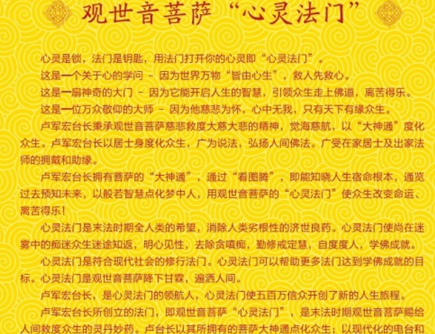 近年来,有个名为“心灵法门”的组织打着佛教旗号,在境外频频举办法会,通过网络大肆传播,迷惑了一些想皈依佛教的信众。那么,这个“心灵法门”到底是什么组织? 经了解,“心灵法门”,又名“卢台长心灵法门”、“观世音菩萨心灵法门”,是由澳籍华人卢军宏于2000年前后创立。卢军宏,自称“卢台长”,男,1960年生于上海,曾在上海长宁沪剧团、静安越剧团的工作过,1989年出国到澳大利亚并加入澳籍。2007年6月,卢军宏在澳创办了东方华语广播电台,自任董事长兼台长。 卢军宏利用他的电台,开办《玄艺问答》、《直话直说》、《白话佛法》、《玄艺综述》等栏目传播“心灵法门”。 被罩上光环的卢军宏 佛教界公认“心灵法门”为附佛外道,并非正信佛教。 2014年2月21日,马来西亚各主要佛教团体发布联合文告称,卢军宏所宣扬的“心灵法门”内容,对佛门经咒加注了许多佛门从未有过的诠释,皆非佛所说,告诫广大民众不要受附佛外道的蒙蔽。 2014年6月13日,中国佛教协会新闻发言人就“心灵法门”有关问题发表谈话称,“心灵法门”不符合佛教教义、并非正信佛教。中国佛协发言人同时指出,中国佛教史上从来没有哪位高僧大德在世时公开宣称自己是某佛某菩萨的化身或代言人,佛教的经典和教义中从来没有“看图腾”的说法,“心灵法门”曲解佛教的某些概念和理论,完全不符合佛教教义,呼吁佛教界抵制“心灵法门”。 国家宗教局网页截图 “心灵法门”具有邪教的所有特征。 根据“两高”司法解释,邪教组织是指冒用宗教、气功或者其他名义建立,神化首要分子,利用制造、散布迷信邪说等手段蛊惑、蒙骗他人,发展、控制成员,危害社会的非法组织。 “心灵法门”冒用佛教名义建立。“心灵法门”网站称他们“传播佛教精髓”,“佛友正跟着卢台长学佛念经、修心修行”,学佛的方式就是“念经、放生、许愿”。中国佛教协会明确指出,“心灵法门”不符合佛教教义、并非正信佛教,是国际佛教界的共识。 “心灵法门”神化头目卢军宏。卢军宏自称是“观世音菩萨”的代言人,拥有菩萨的“大神通”,通过“看图腾”,即能知晓人生宿命根本,通览过去预知未来。卢军宏还称有“48个法身”,这些“法身”每天昼伏夜出在梦里去“救人”, 他说的每句话都是“佛言佛语”、“观世音菩萨开示”。中国佛协发言人称,中国佛教史上的确有一些高僧大德被信众尊奉为佛菩萨的化身,但都是后世佛教徒根据这些高僧大德生前的功德事迹追认的,从来没有哪位高僧大德在世时公开宣称自己是某佛某菩萨的化身或代言人。 “心灵法门”网页截图 “心灵法门”编造邪说,控制信徒。“心灵法门”称,现在是“末法时期”,要想改变自己命运,只有搭上“观世音菩萨的救度之船”,而卢军宏是“观世音菩萨”的代言人。要想搭上“救度之船”,就要听卢军宏的节目录音,看卢军宏的书,如《图腾世界》、《小房子常识》、《白话佛法》等。 卢军宏“独创”了一个所谓的“小房子”,这个“小房子”不是现实中的住宅,是卢军宏把佛教的四个经咒(心经、大悲咒、往生咒、七佛灭罪真言)肆意编排成一个组合,信徒按他所规定的遍数念诵,念完后在一张类似小房子图形的黄纸上圆圈内◎点上红点,然后烧掉。卢军宏称,“小房子在天上是大能量,在地下是大票子" “一张小房子在地府可以顶10根金条”,“小房子可以消除孽障、还债”。 “心灵法门”编造的“小房子” 卢军宏说,他已经在天上为“心灵法门”信徒播种好了莲花,将来同他一起“上天”。他说,“只要跟我卢台长,我就同观世音菩萨讲,请观世音菩萨保佑你们避开灾难”,如果对“心灵法门”不虔诚,会“患癌症”“出横事”“鬼上身”。 “心灵法门”网站自我吹嘘(截图) “心灵法门”属非法组织。 “心灵法门”从未在中国有关部门登记注册过,但却在国内搞非法活动,秘密发展成员。近年来,不断有受害者向警方举报“心灵法门”残害信徒、借佛敛财等违法行为。 呼吁网民檫亮眼睛,明辨是非,千万不要误入邪教“心灵法门”的陷阱。 (责任编辑:辛木) |