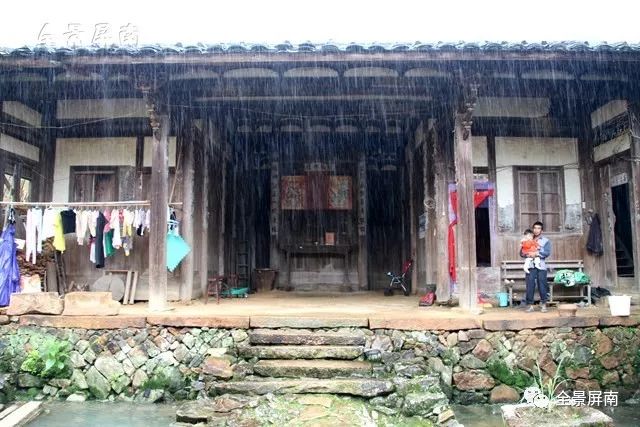 贰 断壁残垣,有断瓦欲坠;蒹葭苍苍,有鸟儿栖息。老宅显然有些没落了,但她庞大的身躯依然挺立。我卯起手指数着残墙走近老宅,她的横侧面分别由九堵和七堵大土墙围拢,占地面积近600平方米。驻足老宅前,看细雨在凹凸不平的土墙上挂珠,滴落;看墙头上的芦苇在风雨中摇曳,耷拉。岁月,沧桑,无奈,没落,等等,那些与时间相关的词语不断从我的脑海中蹦跳出来。不用考证,单从外观就可以大致判断出,岁月在这座老宅上雕刻出的年轮。 ![]() 老宅临溪而筑,面朝蜿蜒龙山,左拥第一旗山,右伴第二旗山,背枕笔架文峰。诗书弄雅,耕读传家,主人的情操及所寄予的心里暗示等皆写在房前屋后的一山一水之中。“作字欣邀新雁侣,挥毫长借暮云春。”我咀嚼着老宅后裔清贡生韦肇河的诗句,登上大门前三级蹬石进得下廊,左右两个大天井,接的是瓦楞上落下的寓意生生不绝的长生水,边上闲置一个外方内圆的井底臼,两个天井间有五级蹬石直上厅堂。 宅内立柱粗大,直透屋顶,为典型的穿斗式构架,大有顶天立地之势,空间布局明敞疏朗,一幅大家气派。与之形成鲜明对比的是,厅堂两侧几乎没有木雕或彩绘装饰,横梁线条粗犷,即使是太师壁及两侧廊道屏风上的镂空木雕装饰,也显得相对简约,少了那种大户人家不可或缺的精雕细作,就连础石也是采用原石铺垫,而不作任何雕饰,它庞大的躯壳里是精瘦的,有着明代建筑的简约风格。“明朝厝”果然名不虚传,稳重凝练的建筑风格又为老宅年龄的真实性增加了筹码。 ![]() 立于厅堂,可享受习习清风;面朝来龙冈,可静听门前潺潺流水声,可观赏青山雾绕白云飞。由于面前的高墙挡住了一眼望穿青山绿水的视线,这使我注意到老宅的大门开在老宅的最左侧,恰可接住源源不绝的长流水。村里人认为,水为宅之财,水的流动暗藏着一种神秘的力量,顺风顺水则财旺,反之,则会带来某种煞气。我前后左右仔细察看了老宅的明暗水沟,发现不管是后厅还是下廊的出水,都是通过一条精心设计的曲折线路排出宅外。而水的进入,则由自来水管直接引入。 我私下踅摸,在笕引时代,这水应该是从后门直接引入的吧!如此,主人家的财源方能滚滚而入,花钱则一曲三折,盈余其中。