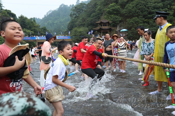今日屏南消息(甘叶斌 张声平 陈阿娜)水上舞蹈、拔河、泼水、赛龙舟、鸳鸯板竞走......8月18日,福建省全民健身运动会(屏南)白水洋水上运动会暨第十五届白水洋鸳鸯溪文化旅游节,在屏南县白水洋景区火热进行。万名游客聚集在雄伟壮观、波光粼粼的浅水广场上,尽情挥洒激情,游戏、嬉闹,共享水上运动的别样乐趣。