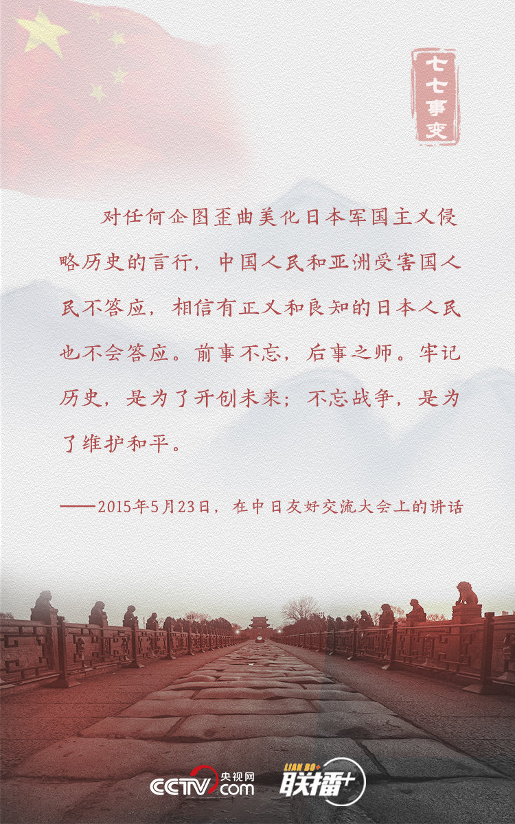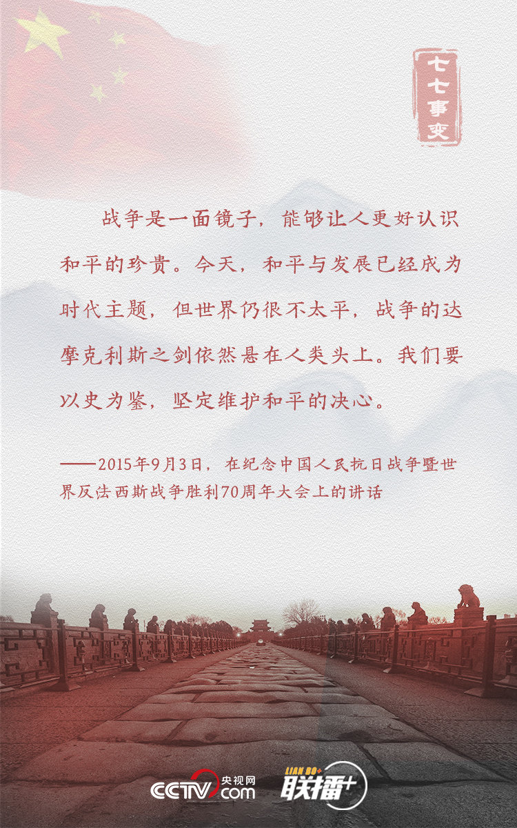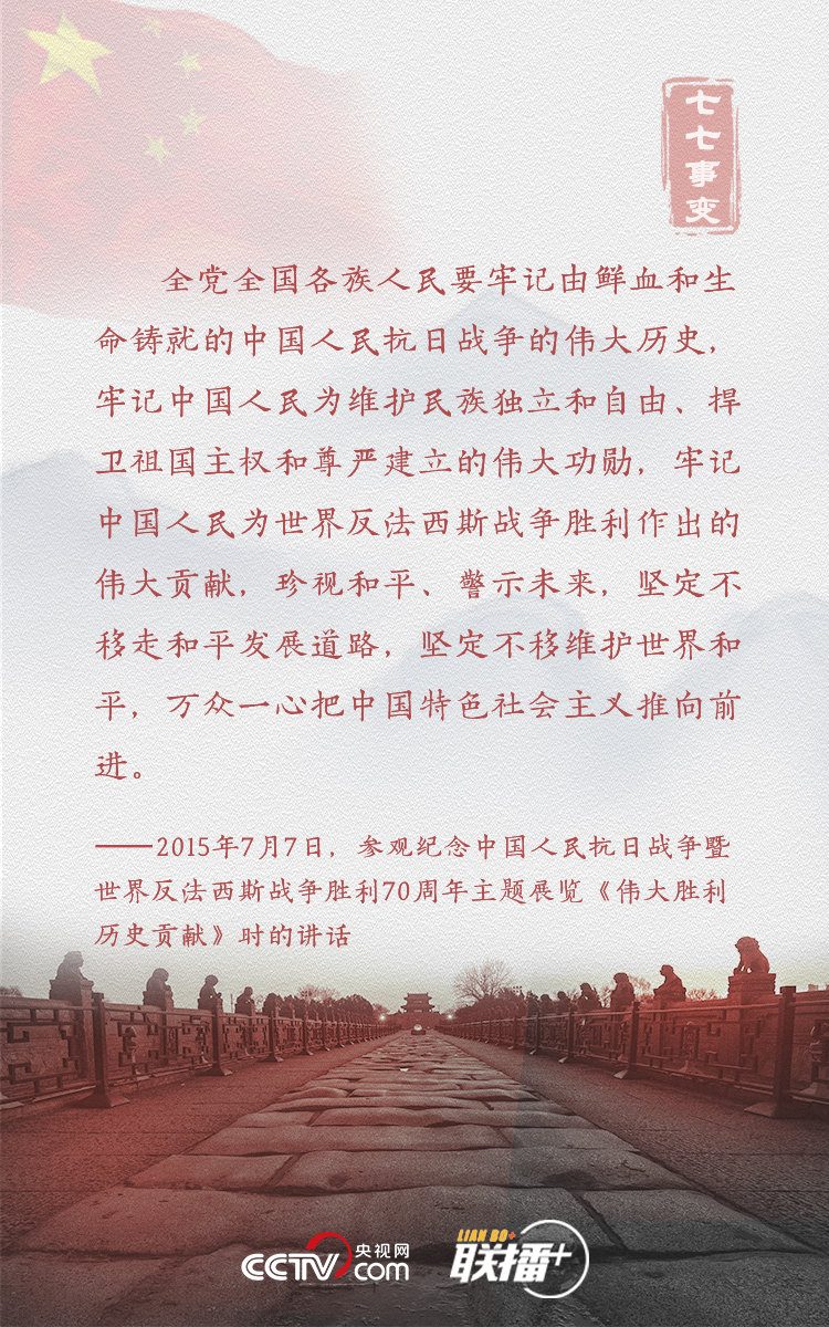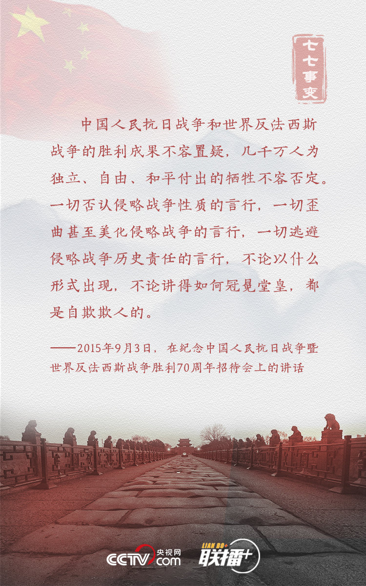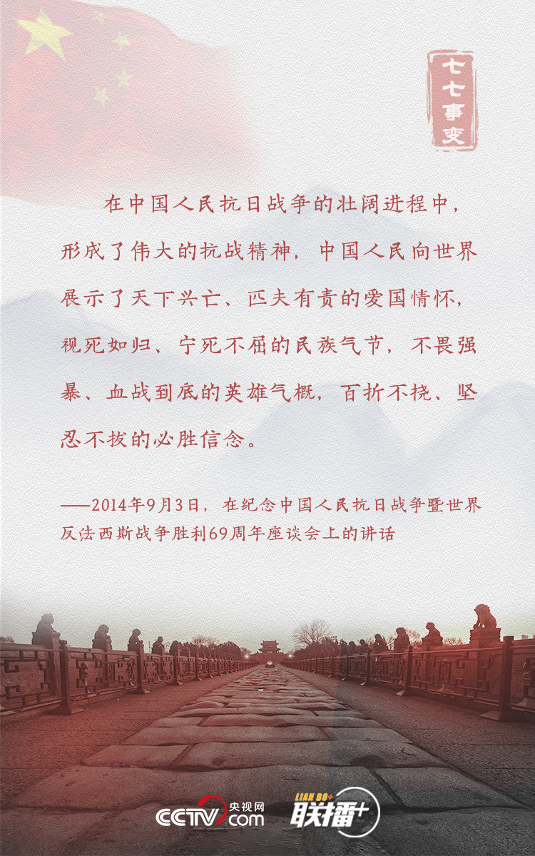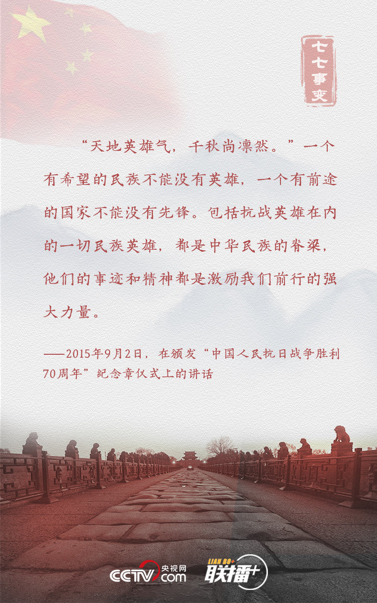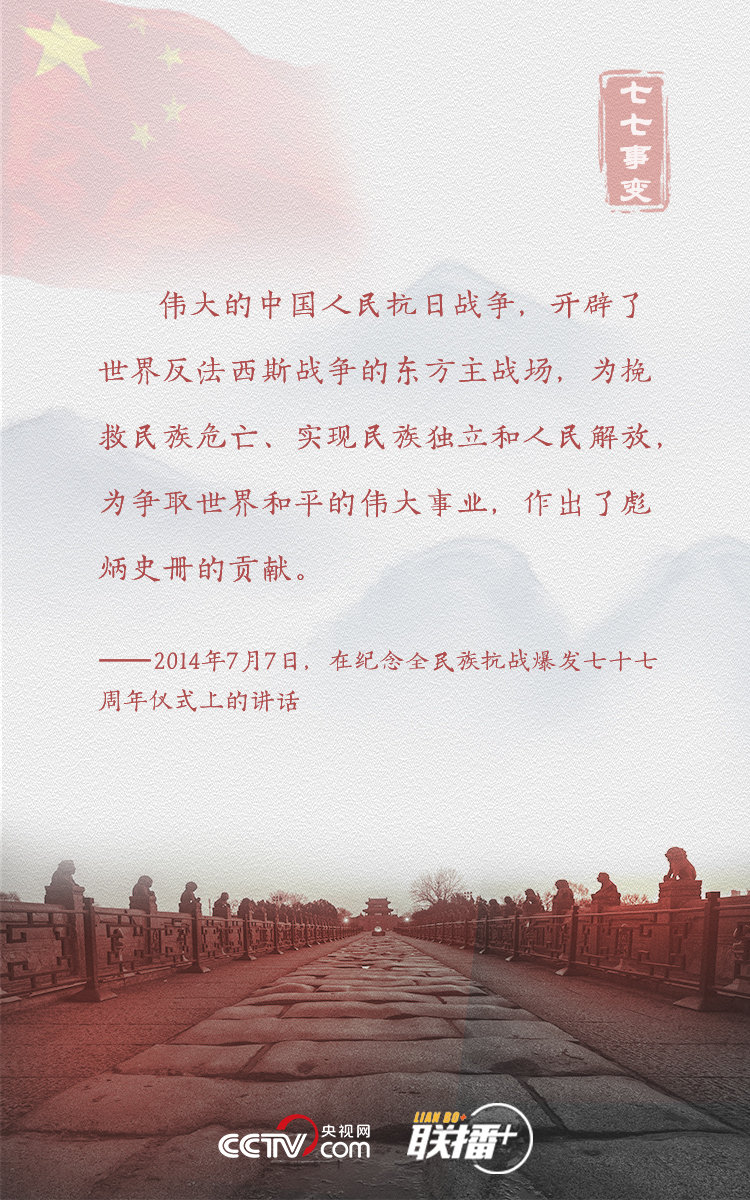联播+“伟大的抗战精神,永远是激励中国人民克服一切艰难险阻、为实现中华民族伟大复兴而奋斗的强大精神动力。” 1937年7月7日,卢沟桥的炮火拉开了中国全民族抗战的序幕。从那时起,大江南北,长城内外,全体中华儿女冒着敌人的炮火共赴国难,千千万万爱国将士浴血奋战、视死如归,各界民众万众一心、同仇敌忾,奏响了一曲气壮山河的抗击日本侵略的英雄凯歌,用生命和鲜血谱写了一首感天动地的反抗外来侵略的壮丽史诗。 在全民族抗战爆发83周年之际,央视网《联播+》特梳理习近平总书记相关论述,与您共同缅怀革命先烈,重温抗战精神,汲取前行力量。 (中央广播电视总台央视网) |