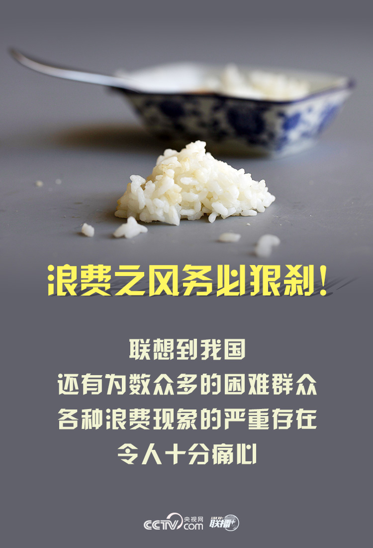 当前,受新冠肺炎疫情影响,全球范围内的饥饿人数有所增加,尽管我国的粮食生产连年丰收,但对粮食安全仍要有危机意识。适逢中秋、国庆双节宴请高峰期,牢记“勤俭是我们的传家宝”,珍惜盘中餐,和总书记一起对浪费说“不”!