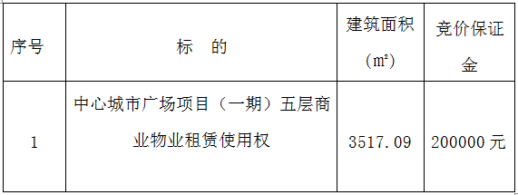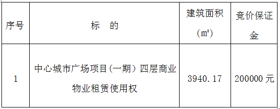 现对我司开发的“中心城市广场”项目部分商业楼层租赁标的广泛征集承租人,特通告如下:1、竞价标的一:我司开发的坐落于屏南县古峰镇长汾社区梨园路1号的中心城市广场项目(一期)四层商业楼层租赁使用权2、竞价标的二:我司开发的坐落于屏南县古峰镇长汾社区梨园路1号的中心城市广场项目(一期)五层商业楼层租赁使用权注:(1)、对上述两个标的物分别进行竞价,整层招租。(2)、上述两个竞价标的的层高、结构、设施设备及毛坯房状况等均以现状为准。4、主要经营的行业或用途:四层商业楼层作为主营餐饮,兼营休闲娱乐(除KTV、超市外)等用途使用;五层商业楼层作为主营KTV休闲娱乐,兼营餐饮(除超市外)等用途使用。5、中标人在装修前需向我司提供该楼层装修方案及业态规划,经我司审核同意后方可实施。二、报名时间:2020年10 月12 日---2020年10 月23 日三、咨询电话:13509591513 13285932566四、看样、报名、缴纳竞价保证金截止时间:2020年10 月23 日下午17:00时五、报名地点:屏南县古峰镇梨园路18号天宇城投公司销售中心六、联系电话:0593-7118555(上午8:30-11:30 下午14:30-17:30) 屏南县天宇城市建设投资有限责任公司 2020年10月11日