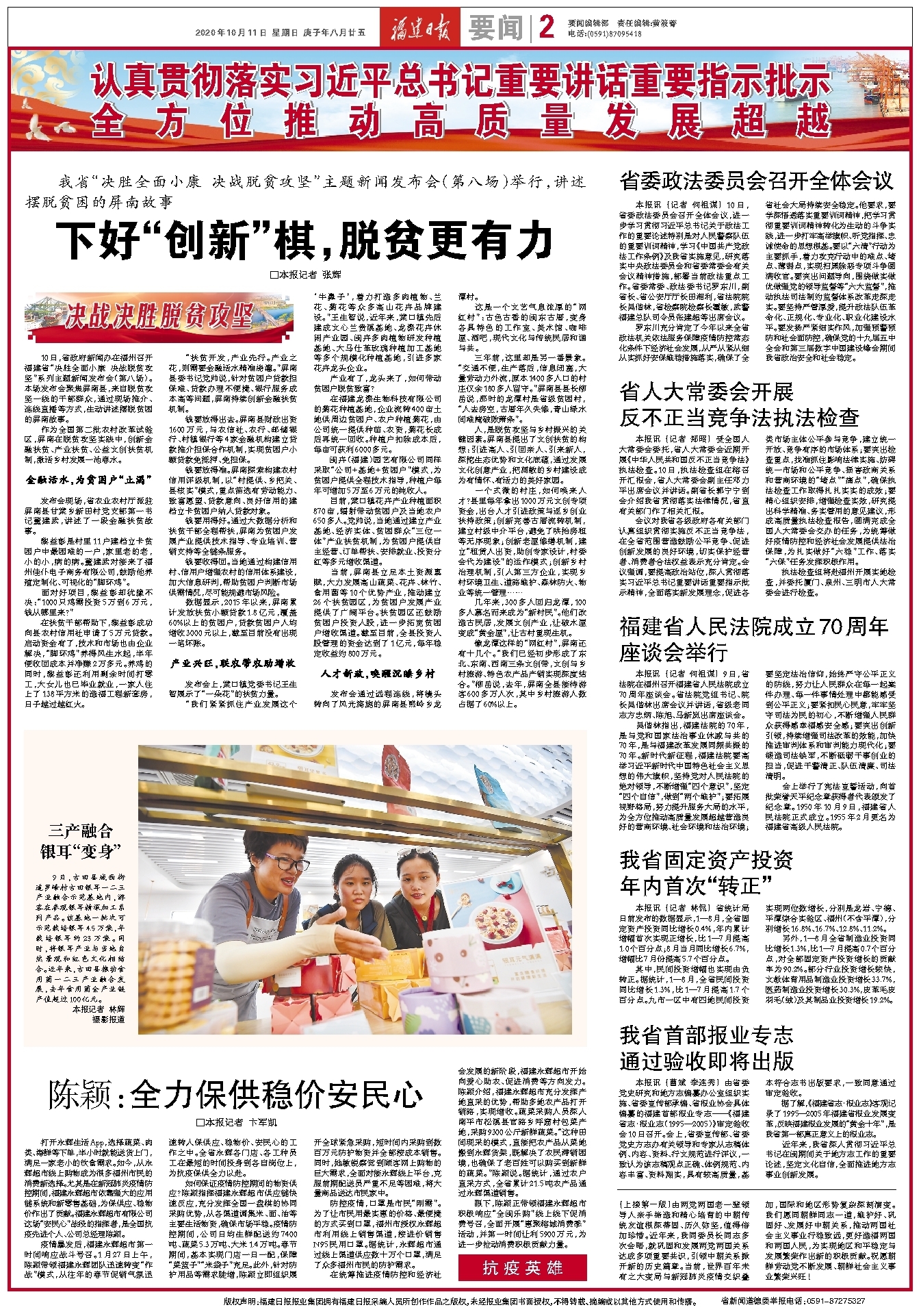 | 下好“创新”棋,脱贫更有力 ----- 我省“决胜全面小康 决战脱贫攻坚”主题新闻发布会(第八场)举行,讲述摆脱贫困的屏南故事 10日,省政府新闻办在福州召开福建省“决胜全面小康 决战脱贫攻坚”系列主题新闻发布会(第八场)。本场发布会聚焦屏南县,来自脱贫攻坚一线的干部群众,通过现场推介、连线直播等方式,生动讲述摆脱贫困的屏南故事。 作为全国第二批农村改革试验区,屏南在脱贫攻坚实践中,创新金融扶贫、产业扶贫、公益文创扶贫机制,激活乡村发展一池春水。 金融活水,为贫困户“止渴” 发布会现场,省农业农村厅派驻屏南县甘棠乡新田村党支部第一书记董建武,讲述了一段金融扶贫故事。 黎益彭是村里11户建档立卡贫困户中最困难的一户,家里老的老,小的小,病的病。董建武对接来了福州佳仆电子商务有限公司,鼓励他养殖定制化、可视化的“脚环鸡”。 面对好项目,黎益彭却犹豫不决:“1000只鸡需投资5万到6万元,钱从哪里来?” 在扶贫干部帮助下,黎益彭成功向县农村信用社申请了5万元贷款。启动资金有了,技术和市场也由企业解决,“脚环鸡”养得风生水起,半年便收回成本并净赚2万多元。养鸡的同时,黎益彭还利用剩余时间打零工,大女儿也已毕业就业,一家人住上了138平方米的造福工程新套房,日子越过越红火。 “扶贫开发,产业先行。产业之花,则需要金融活水精准浇灌。”屏南县委书记党帅说,针对贫困户贷款担保难、贷款办理不便捷、银行服务成本高等问题,屏南持续创新金融扶贫机制。 钱要放得出去。屏南县财政出资1600万元,与农信社、农行、邮储银行、村镇银行等4家金融机构建立贷款推介担保合作机制,实现贫困户小额贷款免抵押、免担保。 钱要放得准。屏南探索构建农村信用评级机制,以“村提供、乡把关、县核实”模式,重点筛选有劳动能力、致富愿望、贷款意向、良好信用的建档立卡贫困户纳入贷款对象。 钱要用得好。通过大数据分析和扶贫干部全程帮扶,屏南为贫困户发展产业提供技术指导、专业培训、营销支持等全链条服务。 钱要收得回。当地通过构建信用村、信用户增强农村的信用体系建设,加大信息研判,帮助贫困户判断市场供需情况,尽可能规避市场风险。 数据显示,2015年以来,屏南累计发放扶贫小额贷款1.8亿元,覆盖60%以上的贫困户,贷款贫困户人均增收3000元以上,截至目前没有出现一笔坏账。 产业兴旺,联农带农助增收 发布会上,棠口镇党委书记王生智展示了“一朵花”的扶贫力量。 “我们紧紧抓住产业发展这个‘牛鼻子’,着力打造多肉植物、兰花、菊花等众多高山花卉品牌建设。”王生智说,近年来,棠口镇先后建成文心兰贵溪基地、龙漈花卉休闲产业园、闽卉多肉植物研发种植基地、大马仕革玫瑰种植加工基地等多个规模化种植基地,引进多家花卉龙头企业。 产业有了,龙头来了,如何带动贫困户脱贫致富? 在福建龙漈生物科技有限公司的菊花种植基地,企业流转400亩土地供周边贫困户、农户种植菊花,由公司统一提供种苗、农资,菊花长成后再统一回收。种植户扣除成本后,每亩可获利6000多元。 闽卉(福建)园艺有限公司同样采取“公司+基地+贫困户”模式,为贫困户提供全程技术指导,种植户每年可增加5万至6万元的纯收入。 目前,棠口镇花卉产业种植面积870亩,辐射带动贫困户及当地农户650多人。党帅说,当地通过建立产业基地、经济实体、贫困群众“三位一体”产业扶贫机制,为贫困户提供自主经营、订单帮扶、安排就业、投资分红等多元增收渠道。 当前,屏南县立足本土资源禀赋,大力发展高山蔬菜、花卉、林竹、食用菌等10个优势产业,推动建立26个扶贫园区,为贫困户发展产业提供了广阔平台。扶贫园区还鼓励贫困户投资入股,进一步拓宽贫困户增收渠道。截至目前,全县投资入股管理的资金达到了1亿元,每年稳定收益约800万元。 人才新政,唤醒沉睡乡村 发布会通过远程连线,将镜头转向了风光旖旎的屏南县熙岭乡龙潭村。 这是一个文艺气息浓厚的“网红村”:古色古香的闽东古厝,变身各具特色的工作室、美术馆、咖啡屋、酒吧,现代文化与传统民居和谐与共。 三年前,这里却是另一番景象。“交通不便,生产落后,信息闭塞,大量劳动力外流,原本1400多人口的村庄仅余180多人留守。”屏南县县长柳岳说,那时的龙潭村是省级贫困村,“人去房空,古厝年久失修,青山绿水间难掩破败萧条”。 人,是脱贫攻坚与乡村振兴的关键因素。屏南县提出了文创扶贫的构想:引进高人、引回亲人、引来新人,深挖生态优势和文化底蕴,通过发展文化创意产业,把凋敝的乡村建设成为有情怀、有活力的美好家园。 一个式微的村庄,如何唤来人才?县里每年拿出1000万元文创专项资金,出台人才引进政策与返乡创业扶持政策;创新完善古厝流转机制,建立村级中介平台,避免了哄抬房租等无序现象;创新老屋修缮机制,建立“租赁人出资,助创专家设计,村委会代为建设”的运作模式;创新乡村治理机制,引入第三方企业,实现乡村环境卫生、道路维护、森林防火、物业等统一管理…… 几年来,300多人回归龙潭,100多人慕名而来成为“新村民”。他们改造古民居,发展文创产业,让破木屋变成“黄金屋”,让古村重现生机。 像龙潭这样的“网红村”,屏南还有十几个。“我们已经初步形成了东北、东南、西南三条