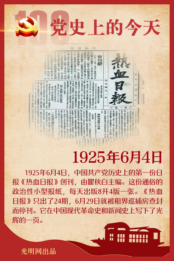 重要论述 1947年6月4日 毛泽东为中共中央起草致各中共中央局、战略区领导人电。电报指出:现在我军作战业已全部由战略防御转变为战略反攻,过去需要破坏的铁路,现在一般地已无此种需要,相反,如果现在还不停止破坏铁路,我们就将做出错误。因此,从现在起,除作战时因为战术上的某些需要,我军所到之处,对于铁路员工及铁路上的铁轨、枕木、路基、桥梁、涵洞、车站设备等项,一律加以保护,并劝告人民一律保护。此外,对于一切普通公私建筑物、道路、桥梁、矿山、工厂、机器、军用或民用物资,均照上项原则,除战术上必要者外,一律重申禁令,不得破坏,即使暂时可被敌利用,亦不要破坏。 1950年6月4日 毛泽东审阅、修改刘少奇准备向全国政协一届二次会议提出的《关于土地改革问题的报告》,并致信刘少奇,对土地改革和划分阶级中涉及的生产关系和使用关系、生产资料和生活资料的区别与联系作了阐述。信中指出:所谓生产力,是指劳动者和生产资料两部分。所谓生产资料,在农村中,首先是土地,其次是农具、牲畜等。粮食是农民利用生产资料生产出来的生活资料。我们将从地主手里没收的粮食和其他被没收的东西列在一起称为生产资料也是可以的,因为这种粮食具有资金的性质。所谓生产关系,是指人们对生产资料的所有关系,即财产的所有权关系。生产资料的使用,例如农民使用(租用)地主的土地,只是地主对于土地的所有关系的结果,这种所有关系表现为佃农对地主的隶属关系(人与人的关系),即是生产关系。过去许多同志在这个问题上犯了二元论(甚至是多元论)的错误,将生产关系和使用关系并列,又将生产资料与生活资料并列,作为划分阶级的标准,把问题弄得很糊涂,划错了许多人的阶级成分。这封信和毛泽东修改的两段文字,合编收入《毛泽东文集》第六卷。 1985年6月4日 邓小平在中央军委扩大会议上的讲话中,宣布中国政府决定减少军队员额一百万,并阐述了军队精简的重大意义。他指出:我们下这样大的决心,把中国人民解放军的员额减少一百万,这是中国共产党、中国政府和中国人民有力量、有信心的表现。它表明,拥有十亿人口的中华人民共和国,愿意并且用自己的实际行动对维护世界和平做出贡献。减少一百万,实际上并没有削弱军队的战斗力,而是增强了军队的战斗力。 他谈到中国对国际形势判断和对外政策的两个重要转变指出:第一个转变,是对战争与和平问题的认识。世界战争的危险还是存在的,但是,世界和平力量的增长超过战争力量的增长。由此得出结论,在较长时间内不发生大规模的世界战争是有可能的,维护世界和平是有希望的。根据对世界大势的这些分析,以及对我们周围环境的分析,我们改变了原来认为战争的危险很迫近的看法。第二个转变,是我们的对外政策。过去一段时间,针对苏联霸权主义的威胁,我们搞了“一条线”战略,就是从日本到欧洲一直到美国这样的“一条线”。现在我们改变了这个战略,这是一个重大的转变。我们奉行独立自主的正确的外交路线和对外政策,高举反对霸权主义、维护世界和平的旗帜。中国的发展是和平力量的发展,是制约战争力量的发展。现在树立我们是一个和平力量、制约战争力量的形象十分重要,我们实际上也要担当这个角色。只要坚持这样的判断和政策,我们就能放胆地一心一意地好好地搞我们的四个现代化建设。 他谈到军队建设问题指出:军队装备真正现代化,只有国民经济建立了比较好的基础才有可能。所以,我们要忍耐几年。到本世纪末我们肯定会超过翻两番的目标,到那个时候我们经济力量强了,就可以拿出比较多的钱来更新装备。先把经济搞上去,一切都好办。现在就是要硬着头皮把经济搞上去,就这么一个大局,一切都要服从这个大局。这篇讲话收入《邓小平文选》第三卷。 1996年6月4日 江泽民在河南省考察农业和农村工作时讲话提出,要逐步建立起有中国特色的对农业强有力的支持和保护体系。他指出:我国正处在工业化快速发展的阶段。国外情况表明,在这个阶段农业往往容易被忽视。发达国家在经历这个发展阶段时,大致有两种情况:一种是在工业化加速发展时,农业衰退,农产品主要依靠进口,等初步实现工业现代化后,再回过头来支持和加强农业;一种是在工业化的过程中始终重视农业,不仅防止了农业的衰退,而且使农业成为国民经济发展的一个重要支柱。我国是一个大国,有十几亿人口,这样的基本国情决定了我国的农业尤其是粮食生产,在经济发展的任何阶段,都绝不能削弱,而只能加强。要高度重视农业生产,始终保持粮食产量的稳定增长。在农村经营体制上,要全面、深刻地领会邓小平同志关于农村改革和发展的“两个飞跃”思想,对于以家庭联产承包为主的责任制和统分结合的双层经营体制,既要坚持长期稳定,又要在实践中不断加以完善和提高。要通过不断探索,逐步建立起有中国特色的对农业强有力的支持和保护体系,并使之制度化、法律化。这篇讲话以《加强农业基础,深化农村改革,推进农村经济和社会全面发展》为题,收入江泽民《论社会主义市场经济》。 党史回眸 1925年 6月4日 中国共产党历史上的第一份日报《热血日报》创刊,由瞿秋白主编。这份通俗的政治性小型报纸,每天出版8开4版一张。《热血日报》在密切配合政治斗争、及