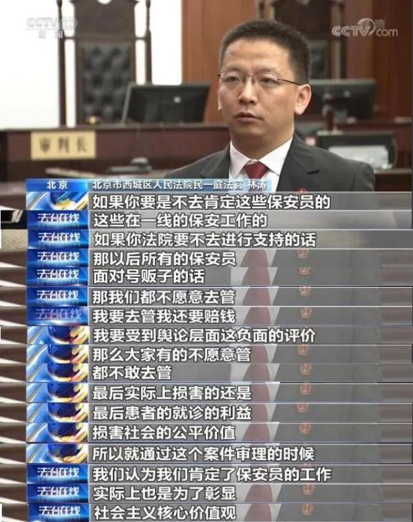 北京市西城区人民法院民一庭法官 林涛:因为韩某伤情比较重,两处骨折,所以当时认定是轻伤一级,韩某到法院来提起民事诉讼。 原告韩某认为,被告保安员杨某将其摔伤,侵犯了韩某的人身合法权益,杨某应对韩某的损伤承担赔偿责任。 北京市西城区人民法院民一庭法官 林涛:他说我是一个正常就诊患者,你对我进行了这个不合理的这种暴力侵害,认为这保安员的行为是违法的,侵犯他的公民的正常的身体权来起诉,说这个行为超过了保安员正常的一个保安职责的工作限度。 此外原告认为,保安员杨某所属的保安公司及北京积水潭医院也应当承担赔偿责任。 北京市西城区人民法院民一庭法官 林涛:韩某认为保安员杨某,包括医院以及保安公司对他的摔倒都有责任,所以要到法院去提起诉讼,要求赔偿各项损失,共计38万余元。 保安员陈述追赶原告理由 韩某在医院受伤骨折,他认为阻拦他离开的医院保安员对此应该承担责任,不过在庭审中,保安员杨某称追赶韩某是事出有因。 审判员 林涛:你当时追这个原告的时候,是什么原因,当时怎么考虑的? 被告 保安员杨某:当时我是接到我们医院保卫处的通知,让我追一个号贩子,就是原告。 审判员 林涛:当时是接到上级主管部门通知让你去的,是吧? 被告 保安员杨某:对,对。