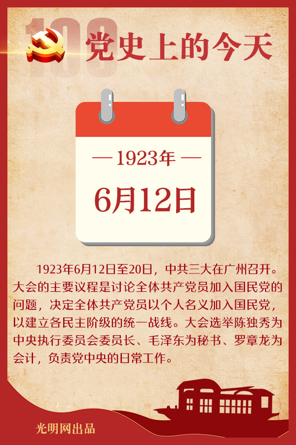 重要论述 1929年6月12日 中共中央政治局召开会议,讨论毛泽东四月五日的来信等。周恩来发言指出:中央二月致毛泽东、朱德的信提出让红军分散等意见是有些毛病。常委已决定召集一次军事会议,详细讨论各地红军问题,朱德、毛泽东处应派一得力人员来参加。建议征调一部分军事人才派往红四军。周恩来还指出:目前农运问题客观上是忽略的,中国游击区域割据的形势是存在的,问题是要有城市的领导。会议同意毛泽东的意见,红军应采取集中游击的策略,中央应坚决改变分散红军的原则。 1936年6月12日 中共中央政治局在瓦窑堡召开会议,讨论两广事变(即西南事变)及整个形势发展的问题。周恩来报告两广事变爆发的原因,指出:一是由于日本对华侵略,英、日矛盾加剧;二是统治阶级内部分裂,反蒋抗日运动高涨;三是民族资产阶级的推动,这个事变是抗日的。毛泽东发言指出:时局发展到一个新的阶段。日本派兵到华北,国民党中央的势力退出华北,中国内部起了很大变化。帝国主义世界也起了变化,英国原是支持日本侵略中国的,现在变为反对日本侵略中国。西北是抗日的大本营,西南事变的发动,对西北也起了作用。我们的口号,我们的重心是抗日,请蒋出兵,以扫除抗日阻碍。会议决定党的策略是:支持两广提出的北上抗日,反对蒋派兵南下;用召开救国会议来反对国民党的五届二中全会;号召全国人民抗日,实现西北大联合。 1944年6月12日 毛泽东会见中外记者西北参观团并回答提问。谈到六月六日英、美军队在法国诺曼底地区对德军实施战略性登陆作战,开辟欧洲第二战场问题,他指出:第二战场开辟的影响是很广泛的,直接影响欧洲,现在欧洲已进到决战阶段了,将来亦会影响到太平洋与中国,远东决战亦快要到来了。谈话中,他主要谈了中共的希望和它自己的工作问题,指出:中国缺乏一个为推进战争所必需的民主制度。我们所希望于国民政府、国民党及一切党派的,就是从各方面实行民主。民主必须是各方面的,是政治上的,军事上的,经济上的,文化上的,党务上的以及国际关系上的。我们很需要统一,但是只有建筑在民主基础上的统一,才是真统一。我们共产党为着打倒日本帝国主义而做的一切工作,都贯彻着一个民主统一或民主集中的精神。我们认为全中国只有民主制度、民主作风,目前才能胜敌,将来才能建立一个很好的和平的国内关系与国际关系。这篇答记者问收入《毛泽东文集》第三卷。 1987年6月12日 邓小平会见南斯拉夫共产主义者联盟中央主席团委员科罗舍茨时,谈到中国改革的必要性、内容和目的、目标。他指出:改革步子要加快。我是主张改革的,不改革就没有出路,旧的那一套经过几十年的实践证明是不成功的。改革是全面的改革,包括经济体制改革、政治体制改革和相应的其他各个领域的改革。开放是对世界所有国家开放,对各种类型的国家开放。政治体制改革不能搬用西方那一套所谓的民主,不能搬用他们的三权鼎立,不能搬用他们的资本主义制度,而要搞社会主义民主。我们要根据社会主义国家自己的实践、自己的情况来决定改革的内容和步骤。每一个社会主义国家的改革又都是不同的,历史不同,经验不同,现在所处的情况不同,各国的改革不可能一样。但是,共同的一点是要保持自己的优势,避免资本主义社会的毛病和弊端。我们改革总的目的是要有利于巩固社会主义制度,有利于巩固党的领导,有利于在党的领导和社会主义制度下发展生产力。对中国来说,就是要有利于贯彻执行党的十一届三中全会以来所制定的一系列路线、方针、政策。要做到这些,我个人考虑有三条:第一,党和行政机构以及整个国家体制要增强活力,就是说不要僵化,要用新脑筋来对待新事物;第二,要真正提高效率;第三,要充分调动人民和各行各业基层的积极性。我们的改革不能离开社会主义道路,不能没有共产党的领导,这两点是相互联系的,是一个问题。这篇谈话的一部分以《改革的步子要加快》为题,收入《邓小平文选》第三卷。 2015年6月12日 中共中央举行纪念陈云同志诞辰110周年座谈会。习近平在讲话中指出,在20世纪中国苦难而辉煌的历史进程中,涌现出一大批用特殊材料制成的优秀共产党人。陈云同志身上表现出来的坚定理想信念、坚强党性原则、求真务实作风、朴素公仆情怀、勤奋学习精神,永远值得我们学习。我们纪念陈云同志,就要学习他坚守信仰的精神。无论处于顺境还是逆境,陈云同志始终坚守对马克思主义、共产主义的信仰不动摇。全党同志一定要坚守共产党人精神家园,把改造客观世界和改造主观世界结合起来,切实解决好世界观、人生观、价值观问题,练就共产党人的钢筋铁骨,铸牢坚守信仰的铜墙铁壁,矢志不渝为中国特色社会主义共同理想而奋斗。 党史回眸 1923年 6月12日至20日 中共三大在广州召开。大会的主要议程是讨论全体共产党员加入国民党的问题,决定全体共产党员以个人名义加入国民党,以建立各民主阶级的统一战线。大会发表了宣言,通过关于劳动问题、农民问题、青年运动、妇女运动等决议。大会选举陈独秀为中央执行委员会委员长、毛泽东为秘书、罗章龙为会计,负责党中央的日常工作。大会以后,党的各级组织对党员群众进行教育,消除共产党员加入国民党的疑虑;同时积极推动孙中山、廖仲恺等改组国民党