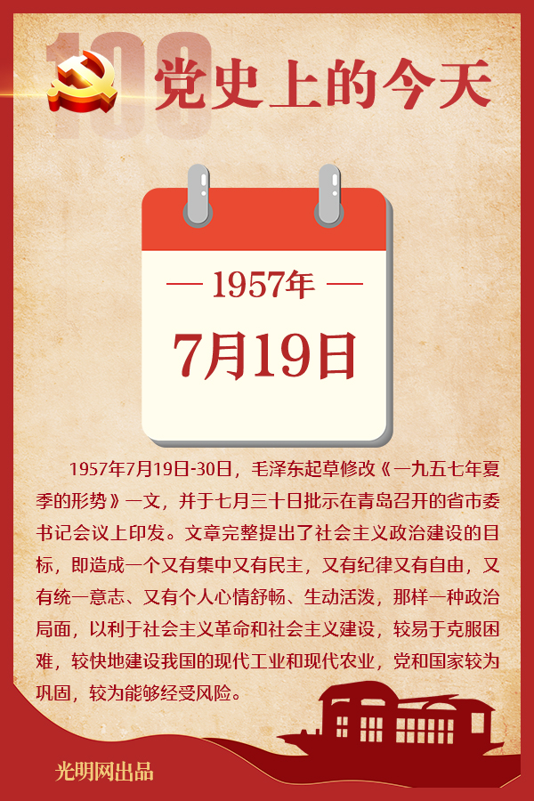 重要论述 1957年7月19日—30日 毛泽东起草修改《一九五七年夏季的形势》一文,并于七月三十日批示在青岛召开的省市委书记会议上印发。文章完整提出了社会主义政治建设的目标,即造成一个又有集中又有民主,又有纪律又有自由,又有统一意志、又有个人心情舒畅、生动活泼,那样一种政治局面,以利于社会主义革命和社会主义建设,较易于克服困难,较快地建设我国的现代工业和现代农业,党和国家较为巩固,较为能够经受风险。文章指出:总题目是正确地处理人民内部的矛盾和正确地处理敌我矛盾。方法是实事求是,群众路线。所谓正确处理人民内部矛盾问题,就是我党从来经常说的走群众路线的问题。共产党员要善于同群众商量办事,任何时候也不要离开群众。党群关系好比鱼水关系。如果党群关系搞不好,社会主义制度就不可能建成;社会主义制度建成了,也不可能巩固。 文章要求:共产党员一定要有朝气,一定要有坚强的革命意志,一定要有不怕困难和用百折不挠的意志去克服任何困难的精神,一定要克服个人主义、本位主义、绝对平均主义和自由主义,否则就不是一个名副其实的共产党员。必须懂得,在我国建立一个现代化的工业基础和现代化的农业基础,从现在起,还要十年至十五年。只有经过十年至十五年的社会生产力的比较充分的发展,我们的社会主义的经济制度和政治制度,才算获得自己的比较充分的物质基础,我们的国家(上层建筑)才算充分巩固,社会主义社会才算从根本上建成了。为了建成社会主义,工人阶级必须有自己的技术干部的队伍,必须有自己的教授、教员、科学家、新闻记者、文学家、艺术家和马克思主义理论家的队伍。这是一个宏大的队伍,人少了是不成的。各省、市、自治区要有自己的马克思主义理论家,自己的科学家和技术人才,自己的文学家、艺术家和文艺理论家,要有自己的出色的报纸和刊物的编辑和记者。 1981年7月19日 邓小平在会见美国前总统国家安全事务助理布热津斯基,谈到中美关系时指出:我们有共同的信念,即不是把中美关系当作一般的、一个时期的或策略性的关系,而是从全球战略角度来看待我们的关系。只有从这个角度来看中美关系,才能有基础,才能发展关系,起码是维护现有的关系。在谈到毛泽东在中国革命历史上的地位和作用时说:“毛主席”这一称呼,在江西根据地就有。那时他是中华苏维埃临时中央政府主席,就这样一直称呼下来了。称他“毛主席”,反映了人民对他的尊敬和爱戴。他确实在几个重要的关键时刻挽救了革命。在谈到中国国内形势时指出:相当长一个时期,有人怀疑中国是否稳定、安定。通过十一届六中全会的召开,政策的连续性有了保证。政治上我们要建立高度民主、高度文明的社会主义国家;经济上我们要一心一意搞四个现代化建设。十一届六中全会肯定了这条路线,而且从组织上保证了这条路线延续下去。 1999年7月19日 江泽民在省、自治区、直辖市党委负责同志会议上讲话。他指出:西方国家的一些人,总想把他们那套民主制度强加给我们,总想让我们实行西方式的民主。在这个问题上,我们同西方国家一直在进行尖锐的斗争。西方敌对势力打所谓的“民主”牌,实质就是要实现他们西化、分化中国的政治图谋。我们千万不能上这个当。我国有十二亿多人口,搞西方的那一套三权鼎立、多党竞选,肯定会天下大乱。在这个问题上,我们的各级领导干部特别是高级干部头脑一定要清醒。在谈到培养和选拔干部问题时说:总结我们党培养和选拔干部的历史经验,可以得出一个重要的结论:不经过斗争实践的锻炼,干部就不能在群众中建立权威;没有受到群众支持和拥护的权威,干部就不能顺利有效地行使自己的职权去带领群众不断创造新的业绩。我们的一切权力,都是人民群众赋予的。不在群众斗争的伟大实践中经风雨、见世面,干部难以真正成长和成熟起来。 2017年7月19日 新调整组建的军事科学院、国防大学、国防科技大学成立大会暨军队院校、科研机构、训练机构主要领导座谈会举行。习近平在讲话中指出,调整组建新的军事科学院、国防大学、国防科技大学,是党中央和中央军委着眼实现中国梦强军梦作出的重大决策,是推进改革强军、构建我军新型军事人才培养体系和军事科研体系的战略举措,必将对加快推进国防和军队现代化、把我军建设成为世界一流军队产生重大而深远的影响。 他强调,把我军建设成为世界一流军队必须有一流军事人才、一流军事理论、一流军事科技。科技是现代战争的核心战斗力。我们要赢得军事竞争主动,必须下更大气力推进科技兴军,坚持向科技创新要战斗力,依靠科技进步和创新把我军建设模式和战斗力生成模式转到创新驱动发展的轨道上来。我军院校、科研机构、训练机构是推进科技兴军的骨干力量,地位重要、使命光荣,必须勇担重任、走在前列。 党史回眸 1960年 7月19日 总政治部批转济南军区《关于组织青年学习毛泽东著作的报告》,要求各级领导积极组织士兵学习毛泽东著作。学习毛泽东著作的群众运动在全军逐步开展起来。在学习中,解放军涌现出以雷锋、南京路上好八连为代表的一大批先进人物和先进单位。 2001年 7月19日 庆祝西藏和平解放50周年大会在拉萨举行。胡锦涛出席大会并发表讲话,指出西藏的和平解放是中