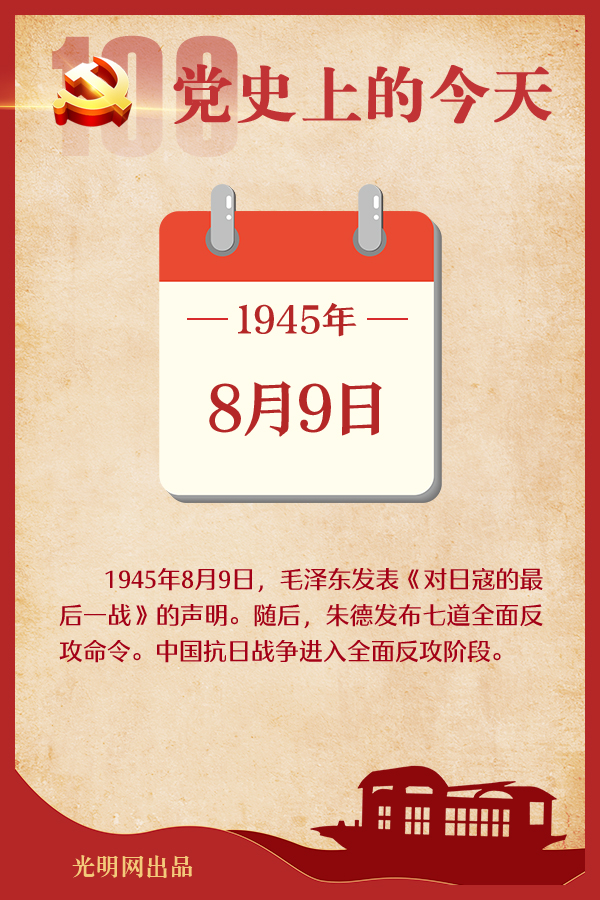 重要论述 1945年8月9日 毛泽东主持召开中共七届一中全会第二次会议,讨论时局问题。毛泽东阐述了苏联参战后的形势和党的方针、任务,指出:苏联参战,使抗日战争进入最后阶段。我们准备发表一个声明。我们的任务有四项,即配合作战、制止内战、集中统一、国共谈判。如何同苏联红军配合作战,还要等战争的展开。我们现在要做的是配备干部,发展攻势,准备几十个旅打仗,考虑一个计划。我们要对日本军队放手进攻,这不会犯冒险主义,要学习较大规模的作战。如果在战略上今天还不放手就会犯错误,当然战役上要谨慎。日本交防给蒋介石,这种接防一般地是难于制止的,中间是蒋,我们的文章就在左右两翼做。我们在第一个时期的主要方针是取之于日伪,扩大了地方,扩大了力量,然后才有可能在第二时期回过头来对付内战的威胁。在干部分配、财政、城市工作、装备分配等方面,都要考虑集中统一问题,大城市归中央管。在苏、美、中协定的基础上准备继续国共谈判,国共谈判要在国际的基础上(不是一切)来解决。苏联参战后,美国的政策可能有某些改变,但靠蒋介石是一定的,所以我们与美、蒋是一个长期的麻烦。内战的危险随着日本垮台而增加。 同日 毛泽东就苏联对日宣战发表声明。声明指出:中国人民热烈欢迎苏联对日宣战,最后地战胜日本侵略者及其一切走狗的时间已经到来了。中国人民的一切抗日力量应举行全国规模的反攻,密切而有效力地配合苏联及其他同盟国作战。八路军、新四军及其他人民军队,应在一切可能条件下,对于一切不愿投降的侵略者及其走狗实行广泛的进攻。这篇声明以《对日寇的最后一战》为题,收入《毛泽东选集》第三卷。 1963年8月9日 毛泽东同索马里总理舍马克谈话。谈话指出:我们赞成全世界人民从帝国主义、殖民主义的统治下解放出来。只有到那个时候,世界人民才会安宁,我们自己也才会最后得到安宁。受压迫的人民自己总是要起来的。我们认为,支持就是声援,给予经济上的帮助,必要时并给予武器援助。 党史回眸 1945年 8月9日 毛泽东发表《对日寇的最后一战》的声明。随后,朱德发布七道全面反攻命令。中国抗日战争进入全面反攻阶段。 1952年 8月9日 《中华人民共和国民族区域自治实施纲要》公布施行,对民族自治地方的建立、自治机关的组成和自治权利等重要问题作出明确规定。此前,成立于1947年5月1日的内蒙古自治政府于1949年12月2日改称内蒙古自治区人民政府。1955年10月1日,新疆维吾尔自治区成立。1958年3月5日,广西僮族自治区成立(1965年10月12日改称广西壮族自治区)。1958年10月25日,宁夏回族自治区成立。1965年9月9日,西藏自治区成立。 2019年 8月9日 中共中央、国务院印发《关于支持深圳建设中国特色社会主义先行示范区的意见》。 资料来源:中共中央党史和文献研究院网站 |