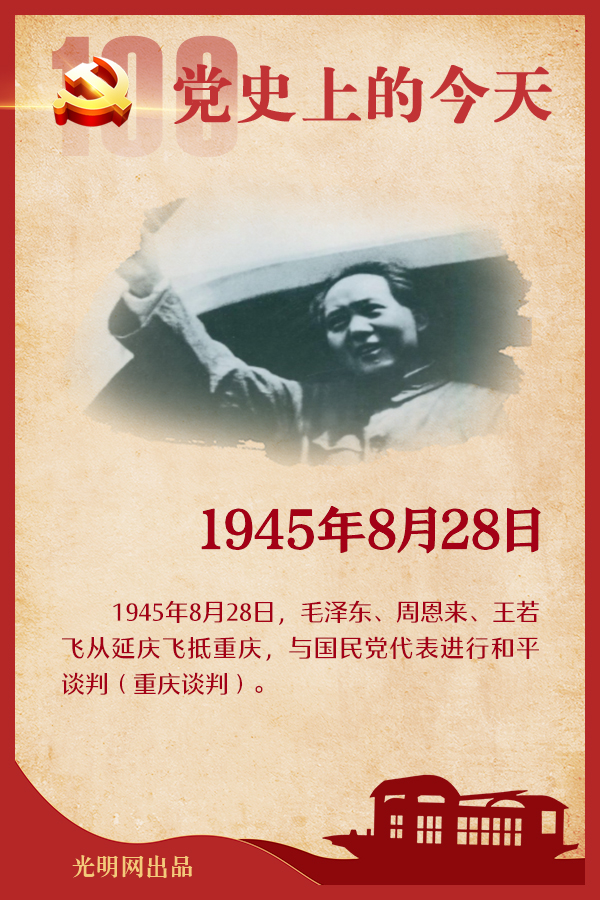 重要论述 1945年8月28日 毛泽东到达重庆,在机场对中外记者发表书面谈话。谈话指出:本人此次来渝,系应国民政府主席蒋介石先生之邀请,商讨团结建国大计。现在抗日战争已经胜利结束,中国即将进入和平建设时期,当前时机极为重要。目前最迫切者,为保证国内和平,实施民主政治,巩固国内团结。国内政治上军事上所存在的各项迫切问题,应在和平、民主、团结的基础上加以合理解决,以期实现全国之统一,建设独立、自由与富强的新中国。希望中国一切抗日政党及爱国志士团结起来,为实现上述任务而共同奋斗。本人对于蒋介石先生之邀请,表示谢意。 1948年8月28日 毛泽东审阅修改中共中央关于请示报告制度决议的第三次稿,加写一段文字。这段文字是:各地党报必须无条件地宣传中央的路线和政策,并不得在宣传中将中央和受中央委托执行中央的路线、政策和任务的机关(即各中央局、分局、军委分会和前委会)处于平列的地位。相反的,必须公开向党内外声明,各受中央委托的机关是执行中央的路线、政策和任务的。各中央局、分局、军委分会及前委会在发出自己的决议、指示、命令和训令时,亦必须注意到此点,不得将自己和中央处于平列的地位,甚或向党内军内将自己造成高出中央的影响。 1980年8月28日 邓小平在政协第五届全国委员会第三次会议上的开幕词中指出:为了把我国建设成为一个现代化的、高度民主、高度文明的社会主义强国,需要用极大的努力,发挥我国社会主义制度的优越性。要进一步加强全体社会主义劳动者、拥护社会主义的爱国者和拥护祖国统一的爱国者的广泛团结,使我国的统一战线和人民政协在发挥社会主义制度优越性的实践中,作出积极的贡献。这篇开幕词以《统一战线和人民政协要为发挥社会主义优越性作出贡献》为题,收入《邓小平论统一战线》。 2020年8月28日至29日 中央第七次西藏工作座谈会召开。习近平出席会议并发表讲话。他强调,面对新形势新任务,必须全面贯彻新时代党的治藏方略,坚持统筹推进“五位一体”总体布局、协调推进“四个全面”战略布局,坚持稳中求进工作总基调,铸牢中华民族共同体意识,提升发展质量,保障和改善民生,推进生态文明建设,加强党的组织和政权建设,确保国家安全和长治久安,确保人民生活水平不断提高,确保生态环境良好,确保边防巩固和边境安全,努力建设团结富裕文明和谐美丽的社会主义现代化新西藏。 他指出,西藏工作必须坚持以维护祖国统一、加强民族团结为着眼点和着力点。要加强对群众的教育引导,广泛发动群众参与反分裂斗争,形成维护稳定的铜墙铁壁。要深入开展党史、新中国史、改革开放史、社会主义发展史教育,深入开展西藏地方和祖国关系史教育,引导各族群众树立正确的国家观、历史观、民族观、文化观、宗教观。要重视加强学校思想政治教育,把爱国主义精神贯穿各级各类学校教育全过程,把爱我中华的种子埋入每个青少年的心灵深处。要培育和践行社会主义核心价值观,不断增强各族群众对伟大祖国、中华民族、中华文化、中国共产党、中国特色社会主义的认同。要挖掘、整理、宣传西藏自古以来各民族交往交流交融的历史事实,引导各族群众看到民族的走向和未来,深刻认识到中华民族是命运共同体,促进各民族交往交流交融。要积极引导藏传佛教与社会主义社会相适应,推进藏传佛教中国化。 他强调,保护好青藏高原生态就是对中华民族生存和发展的最大贡献。要牢固树立绿水青山就是金山银山的理念,坚持对历史负责、对人民负责、对世界负责的态度,把生态文明建设摆在更加突出的位置,守护好高原的生灵草木、万水千山,把青藏高原打造成为全国乃至国际生态文明高地。要深入推进青藏高原科学考察工作,揭示环境变化机理,准确把握全球气候变化和人类活动对青藏高原的影响,研究提出保护、修复、治理的系统方案和工程举措。要完善补偿方式,促进生态保护同民生改善相结合,更好调动各方面积极性,形成共建良好生态、共享美好生活的良性循环长效机制。要加强边境地区建设,采取特殊支持政策,帮助边境群众改善生产生活条件、解决后顾之忧。 党史回眸 1945年 8月28日 毛泽东、周恩来、王若飞赴重庆与国民党代表进行和平谈判(重庆谈判)。10月10日,国共双方签署《政府与中共代表会谈纪要》(双十协定)。 1949年 8月28日 毛泽东为中国人民解放军海军题词:我们一定要建设一支海军,这支海军要能保卫我们的海防,有效地防御帝国主义的可能的侵略。 1989年 8月28日 中共中央政治局举行全体会议,讨论并通过了《关于加强党的建设的通知》。《通知》要求各级党委必须遵照党的基本路线,聚精会神抓党的建设,下决心解决好当前党的建设中的迫切问题。 2003年 8月28日-9月1日 胡锦涛在江西考察工作期间明确提出,要牢固树立协调发展、全面发展、可持续发展的科学发展观。 2013年 8月28日 习近平在视察沈阳战区部队时强调,,要深入贯彻落实党在新形势下的强军目标,加强部队全面建设,不断提高履行使命任务能力,为维护国家主权、安全、发展利益作出新的更大贡献。 2020年 8月28日-29日 中央第七次西藏工作座谈会召开。习近平讲话强调,面对新形势新任务,必须全面贯彻新时代党的治藏方略,铸牢中华民族共同体意识,努力建设团