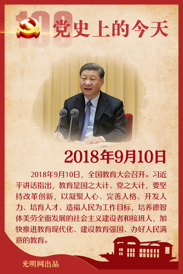 重要论述 1937年9月10日 中共中央政治局召开常委会议,讨论宣传教育工作。毛泽东发言指出:教学要理论联系实际,军事理论应讲授战略思想、战略原则。有的高级军事干部,对战略问题毫无兴趣,上不联系战略,下不联系红军实际,变成外国教条主义;教学法要研究,旧的考试方法要改变,现在的教学法多是注入式,要注意启发式。张闻天指出:主要原则是理论与实际一致,事实上这一点做得很少,理论一定要与实际联系,要中国化。 1940年9月10日 毛泽东为中共中央起草关于时局趋向的指示。指示指出:目前国际国内的政治情况,正处在剧烈变化的前夜,我党对于这种变化,必须在精神上有所准备。国际方面,帝国主义战争带有扩大、持久与准备决战的性质,抗日的中国则将成为帝国主义者双方争夺的对象。国内方面,是三种势力及三种可能性激烈斗争时期,顽固派要求维持现状,投降派准备组织贝当政府,进步派与中间派则要求亲苏、和共与政治改良。第三种可能性的实现,即是中国时局的初步好转。国际国内的大势所趋,将是日益不利于顽固派,而日益有利于进步派与中间派。我们的任务,是坚决执行中央七七宣言及七七决定,团结一切进步派与中间派,分化与拉拢一部分可能起变化的顽固派,尖锐批评维持现状的顽固派,而坚决反对投降派与可能的贝当政府,以期实现初步的政治好转,即实现亲苏和共与政治改良三大方针,然后进一步实现彻底的政治好转,即实现各抗日党派各抗日阶层民主的统一战线政权。当然也要准备对付投降派的突然事变。 1950年9月10日 刘少奇在马列学院第二、三班开学典礼上谈学习马列主义的态度和方法,指出:我们学习马列主义,要学习它的立场、观点、方法,不要把马列主义变成教条。我们党要有很多做理论研究工作的,如果没有很多的理论干部,就不可能领导这样大的国家达到社会主义。这篇讲话收入《刘少奇选集》下卷。 1985年9月10日 邓小平会见美国不列颠百科全书编委会副主席吉布尼时,谈到中国坚持社会主义原则指出:我们坚持社会主义,我们搞的是真正的社会主义,是社会主义的现代化。我们遵循两条最重要的原则,第一,公有制经济始终占主体地位;第二,坚持走共同富裕的道路。一部分地区,一部分人先好起来,不会导致两极分化。我们的改革不会导致资本主义。我们欢迎外商到中国投资,允许一些个体经济存在,不会影响走社会主义道路。 2018年9月10日 习近平在全国教育大会上强调,在党的坚强领导下,全面贯彻党的教育方针,坚持马克思主义指导地位,坚持中国特色社会主义教育发展道路,坚持社会主义办学方向,立足基本国情,遵循教育规律,坚持改革创新,以凝聚人心、完善人格、开发人力、培育人才、造福人民为工作目标,培养德智体美劳全面发展的社会主义建设者和接班人,加快推进教育现代化、建设教育强国、办好人民满意的教育。 他指出,培养什么人,是教育的首要问题。我国是中国共产党领导的社会主义国家,这就决定了我们的教育必须把培养社会主义建设者和接班人作为根本任务,培养一代又一代拥护中国共产党领导和我国社会主义制度、立志为中国特色社会主义奋斗终身的有用人才。这是教育工作的根本任务,也是教育现代化的方向目标。 他强调,要在坚定理想信念上下功夫,教育引导学生树立共产主义远大理想和中国特色社会主义共同理想,增强学生的中国特色社会主义道路自信、理论自信、制度自信、文化自信,立志肩负起民族复兴的时代重任。要在厚植爱国主义情怀上下功夫,让爱国主义精神在学生心中牢牢扎根,教育引导学生热爱和拥护中国共产党,立志听党话、跟党走,立志扎根人民、奉献国家。要在加强品德修养上下功夫,教育引导学生培育和践行社会主义核心价值观,踏踏实实修好品德,成为有大爱大德大情怀的人。要在增长知识见识上下功夫,教育引导学生珍惜学习时光,心无旁骛求知问学,增长见识,丰富学识,沿着求真理、悟道理、明事理的方向前进。要在培养奋斗精神上下功夫,教育引导学生树立高远志向,历练敢于担当、不懈奋斗的精神,具有勇于奋斗的精神状态、乐观向上的人生态度,做到刚健有为、自强不息。要在增强综合素质上下功夫,教育引导学生培养综合能力,培养创新思维。要树立健康第一的教育理念,开齐开足体育课,帮助学生在体育锻炼中享受乐趣、增强体质、健全人格、锤炼意志。要全面加强和改进学校美育,坚持以美育人、以文化人,提高学生审美和人文素养。要在学生中弘扬劳动精神,教育引导学生崇尚劳动、尊重劳动,懂得劳动最光荣、劳动最崇高、劳动最伟大、劳动最美丽的道理,长大后能够辛勤劳动、诚实劳动、创造性劳动。 党史回眸 1935年 9月10日 针对张国焘拒不执行中央北上的正确方针、并企图分裂和危害中央的紧急情况,中共中央发布《为执行北上方针告同志书》。文告指出:目前的形势是完全有利于我们,我们应该根据党中央正确战略方针,继续北进,大量消灭蒋介石、胡宗南的部队,创造川陕甘新苏区。我们无论如何不应该再退回原路,再去翻雪山,走草地,到群众完全逃跑的少数民族地区。“南下是绝路”。只有中央的战略方针是唯一正确的,中央反对南下,主张北上,为红军为中国革命取得胜利,你们应该坚决拥护中央的战略方针,迅速北上,创造川陕甘新苏区去。 194