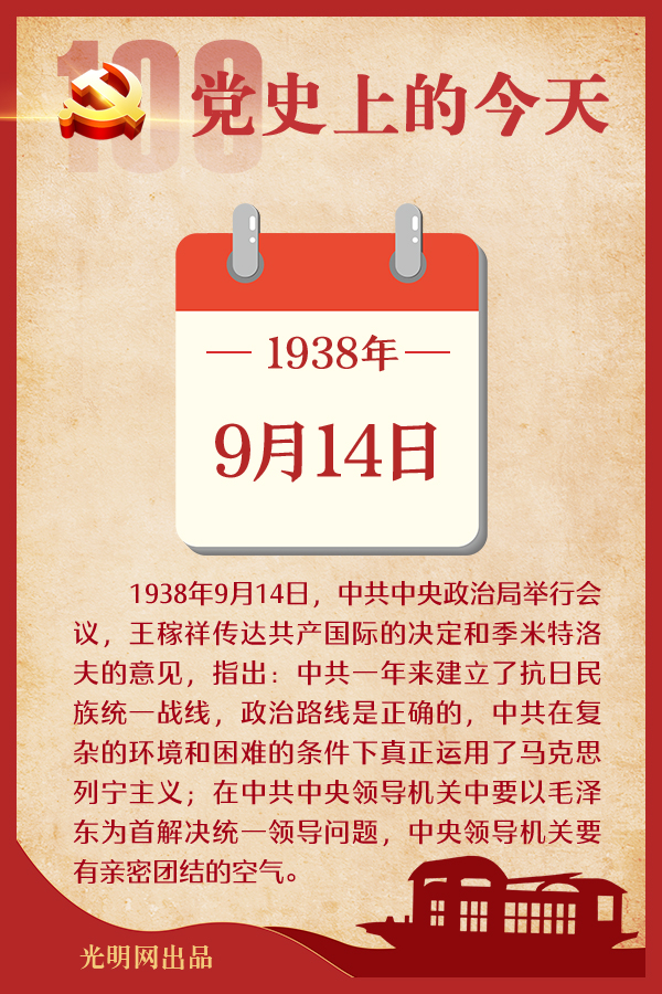 重要论述 1938年9月14日—27日 中共中央政治局举行会议,为召开中共六届六中全会作准备。王稼祥在十四日会议上传达共产国际的指示和共产国际执行委员会总书记季米特洛夫的意见,指出:中共一年来建立了抗日统一战线,尤其是朱德、毛泽东等领导了八路军,执行了党的新政策,政治路线是正确的;中共在复杂的环境和困难的条件下真正运用了马列主义。中央领导机关“要在毛泽东为首的领导下解决。领导机关中要有亲密团结的空气”。 在二十四日的会议上,毛泽东作长篇发言。他指出:共产国际的指示是这次政治局会议成功的保证,同时又是中共六届六中全会和第七次全国代表大会的指导原则,指示的最主要点是强调党内团结。他分析了武汉即将失陷后的形势,指出抗日战争将开始进入一个新的阶段——相持阶段,抗日民族统一战线也将进入一个新的发展阶段。他论述了统一战线中统一与斗争的辩证关系,指出:由于国共合作是对立阶级的政党的合作,所以斗争是严重的不可避免的,具体表现是国民党顽固分子的磨擦和共产党的反磨擦。统一战线中统一是基本的原则,要贯彻到一切地方一切工作中,任何时候任何地方不能忘记统一;同时不能不辅助之以斗争的原则,因为斗争正是为了统一,没有斗争不能巩固与发展统一战线。 在二十六日的会议上,张闻天发言指出:国际批准党的政治路线,更能增进我们的自信心。武汉,我看是要失掉的。在不能保卫时要避免作大的牺牲,要指出中国抗战靠持久战的胜利,而不在一个城市的得失。在持久战过程中要创造新军,但不要将创造机械化部队的口号提得太高,目前中心要强调用现在的武器也可以与敌人作战,即使没有机械化武器,我们还是坚持抗战。我们应估计武汉失守后的危机,要比南京失守时还更严重。但另一方面要看到在敌人的野蛮政策下,蒋还将坚持抗战,只要我们努力,还是能克服当前的困难。关于国共能否长期合作的问题,张闻天指出:只要国民党愿与共产党合作,我们可以与国民党一起来建设社会主义,这就是说,不仅抗战建国,即在建设社会主义时,我们也要与他们合作。中国有和平转变到社会主义的可能,抗战胜利后能够建设“新式的民主共和国”,在“新式民主共和国”中的经济建设有可能保证转变到社会主义。张闻天在发言中还谈到,党内要进行教育,提高党员的警惕性,理论学习最重要的是在实际工作中学习,要有马列主义的知识,要打通马列主义的难关。 在二十六日的会议上,周恩来发言强调:我们必须在保持党的独立性的原则下,拥蒋合作,拥护三民主义,这是巩固统一战线的政治基础。刘少奇讲了党内的团结问题,他指出:要在组织上、党规上保证党的团结,个人服从组织,少数服从多数,下级服从上级。过去在莫斯科有人说,只要在政治上正确,组织上可以不服从,这是不对的。必须无条件服从组织,只能将意见提到上级去解决。 朱德发言指出:共产党要以天下为己任;为了掌握革命的领导权,干部必须要很好地学习马列主义,掌握革命理论。党内团结要实行正确的自我批评,党员要维持对党的领袖的信仰,因此,领导同志要有能接受批评的精神。领袖要听人家说自己的好话,同时还要听说自己不好的话。 在最后一天会议上,毛泽东再次发言,说这次政治局会议取得了伟大的成功,从而可以保证六届六中全会的成功,并建议在六中全会通过一个中央工作规则。这次政治局会议通过了扩大的六届六中全会的议程,决定由毛泽东代表中央向全会作政治报告。 1985年9月14日 邓小平会见奥地利总统基希施莱格,谈到解决国际争端的方式时指出:提出“一国两制”的构想,是为了解决中国的统一问题,但是,这对国际上是否也有些益处?我是指对和平会不会有点益处。维护世界和平,最大的问题是各国都要奉行独立自主的政策,不依附于集团政治,同时也要考虑一些切实可行的解决历史纠纷的方式。我们提出“一国两制”的构想,不只是考虑到解决我们自己的问题,解决中国与有关国家的问题,也向国际社会提出这样一个构想,看是否对和平有利,一切都着眼于维护和平。 2020年9月14日 习近平同德国欧盟领导人共同举行会晤。他指出,当前,新冠肺炎疫情全球大流行使百年未有之大变局加速演进。人类面临许多共同挑战,正站在新的十字路口。中欧作为世界两大力量、两大市场、两大文明,越是面对这样的形势,越要牢牢把握相互支持、团结合作的大方向,越要坚定不移推动中欧全面战略伙伴关系健康稳定发展,为国际社会抗击疫情、恢复经济、维护正义注入更多正能量。 他强调,中欧要做到“4个坚持”。一是坚持和平共处。世界上没有完全相同的政治制度模式,不同文明文化多元共生才是常态。中欧和平共处的力量坚定一分,世界的和平和繁荣就多一分保障。二是坚持开放合作。中国致力于逐步形成以国内大循环为主体、国内国际双循环相互促进的新发展格局。中方将通过不断挖掘内需潜力,实现中欧两大市场、两方资源的更好联通、更大效益,推动中欧共同发展更加强劲、更可持续。三是坚持多边主义。中方愿同欧方在双边、地区、全球层面加强对话和协作,坚持共商共建共享的全球治理观,维护以联合国为核心的国际秩序和国际体系,推动政治解决国际和地区热点问题,推动构建人类命运共同体。四是坚持对话协商。中欧要