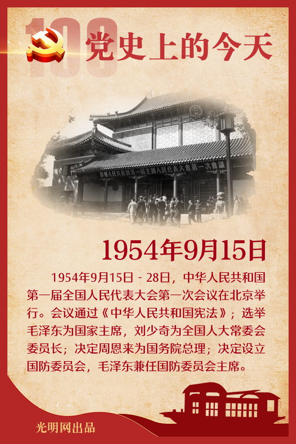 重要论述 1954年9月15日—28日 中华人民共和国第一届全国人民代表大会在北京举行。十五日,毛泽东致开幕词,指出:这次会议是标志着我国人民从一九四九年建国以来的新胜利和新发展的里程碑,这次会议所制定的宪法将大大地促进我国的社会主义事业。我们的总任务是:团结全国人民,争取一切国际朋友的支援,为了建设一个伟大的社会主义国家而奋斗,为了保卫国际和平和发展人类进步事业而奋斗。他强调:领导我们事业的核心力量是中国共产党。指导我们思想的理论基础是马克思列宁主义。我们有充分的信心,克服一切艰难困苦,将我国建设成为一个伟大的社会主义共和国。 刘少奇作《关于中华人民共和国宪法草案的报告》,从我们国家的性质、过渡到社会主义的步骤、人民民主的政治制度和人民的权利与义务、民族区域自治等方面,说明了宪法的基本内容。报告指出:宪法是国家的根本法,全体人民和一切国家机关都必须遵守,共产党员必须在遵守宪法和一切其他法律中起模范作用,全国各族人民要为保证宪法的完全实施而奋斗,为把我国建成一个伟大的社会主义国家而奋斗。 周恩来二十三日在会上作《政府工作报告》。报告指出:社会主义经济的唯一目的,就在于满足人民的物质和文化的需要,而为了充分地满足人民的物质和文化的需要,又必须不断发展社会主义经济。因此,我们人人都要关心提高我们国家的生产力。报告还提出了第一个五年计划的方针:集中主要力量发展重工业,建立国家工业化和国防现代化的基础;相应地发展交通运输业、轻工业、农业和商业;相应地培养建设人才;有步骤地促进农业、手工业的合作化;继续进行对资本主义工商业的改造;保证国民经济中社会主义成分的比重稳步增长,同时正确地发挥个体农业、手工业和资本主义工商业的作用;保证在发展生产的基础上逐步提高人民物质生活和文化生活的水平。 1956年9月15日 中国共产党第八次全国代表大会开幕。毛泽东致开幕词。他总结了中国革命和建设的经验,指出:我国的革命和建设的胜利,都是马克思列宁主义的胜利,把马克思列宁主义的理论和中国革命的实践密切地联系起来,这是我们党的一贯的思想原则。为了迎接即将到来的全面经济建设的高潮,他向全党提出了必须善于学习的任务,指出:要把一个落后的农业的中国改变成为一个先进的工业化的中国,我们面前的工作是很艰苦的,我们的经验是很不够的。因此,必须善于学习。我们决不可有傲慢的大国主义的态度,决不应当由于革命的胜利和在建设上有了一些成绩而自高自大。国无论大小,都各有长处和短处。即使我们的工作得到了极其伟大的成绩,也没有任何值得骄傲自大的理由。虚心使人进步,骄傲使人落后,我们应当永远记住这个真理。这篇开幕词收入《毛泽东文集》第七卷。 同日 刘少奇代表中共中央向八大作政治报告。报告以《论十大关系》的基本精神为指导,在正确地估量社会主义改造完成后国内阶级关系的变化及由此产生的政治形势的基础上,作出把党的工作重心转移到发展社会生产力上来的战略决策。报告指出:现在革命的暴风雨时期已经过去了,新的生产关系已经建立起来,斗争的任务已经变为保护社会生产力的顺利发展。我们党现实的任务,就是要依靠已经获得解放和已经组织起来的几亿劳动人民,团结国内外一切可能团结的力量,充分利用一切对我们有利的条件,尽可能迅速地把我国建设成为一个伟大的社会主义国家。 报告在总结以往经验教训的基础上,肯定了“既积极又稳妥可靠”的经济建设总方针,指出:党中央所建议的第二个五年计划的发展速度是积极的,同时又是稳妥可靠的。发展速度必须是积极的,以免丧失时机,陷入保守主义的错误;又必须是稳妥可靠的,以免脱离经济发展的正确比例,使人民的负担过重,或者使不同的部门互相脱节,使计划不能完成,造成浪费,那就是冒险主义的错误。报告还适应即将开始的大规模经济建设,提出改进国家工作的任务,包括:(一)进一步扩大民主生活,开展反对官僚主义的斗争;(二)适当地调整中央和地方的行政管理职权,发挥中央和地方两个积极性;(三)正确处理少数民族问题;(四)着手系统地制定比较完备的法律,健全国家的法制。这篇报告是中共中央第一代领导集体在探索中国社会主义建设道路中取得的重要成果,收入《刘少奇选集》下卷。 2005年9月15日 胡锦涛在联合国成立六十周年首脑会议上的讲话中提出,建设一个持久和平、共同繁荣的和谐世界。他指出:在机遇和挑战并存的重要历史时期,只有世界所有国家紧密团结起来,共同把握机遇、应对挑战,才能为人类社会发展创造光明的未来,才能真正建设一个持久和平、共同繁荣的和谐世界。要坚持多边主义,实现共同安全;坚持互利合作,实现共同繁荣;坚持包容精神,共建和谐世界;坚持积极稳妥方针,推进联合国改革。这篇讲话以《努力建设持久和平、共同繁荣的和谐世界》为题,收入《十六大以来重要文献选编》(中)。 党史回眸 1944年 9月15日 中共代表林伯渠在国民参政会上提出立即结束国民党一党统治、建立各抗日党派民主联合政府的主张。 1954年 9月15日-28日 一届全国人大一次会议举行。会议通过《中华人民共和国宪法》;选举毛泽东为国家主席,刘少奇为全国人大常委会委员长;决定周恩来为国