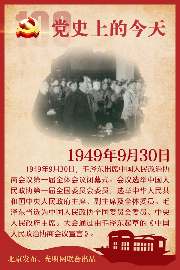 重要论述 1930年9月30日 周恩来在上海主持召开中共中央军委扩大会议,作目前红军的中心任务及其几个根本问题的报告。报告肯定朱毛红军游击战争的战略战术,认为朱毛红军为适应新的斗争形势,从游击战向带游击性的运动战转变,是战略性的转变,是完全正确的。朱毛红军主力从井冈山向赣南进军,开辟新根据地的事实,是开始历史的新篇幅,完全是国内农民战争在无产阶级领导之下走向消灭军阀战争的发展的一个进程。 1949年9月30日 毛泽东出席中国人民政治协商会议第一届全体会议闭幕式。会议选举中国人民政协第一届全国委员会委员,选举中华人民共和国中央人民政府主席、副主席及全体委员。毛泽东当选为中国人民政协全国委员会委员、中央人民政府主席。大会通过由毛泽东起草的《中国人民政治协商会议宣言》。宣言指出:“中国人民政治协商会议第一届全体会议业已胜利地完成了自己的任务。”“中国的历史,从此开辟了一个新的时代。”“中华人民共和国现已宣告成立,中国人民业已有了自己的中央政府。这个政府将遵照共同纲领在全中国境内实施人民民主专政。它将指挥人民解放军将革命战争进行到底,消灭残余敌军,解放全国领土,完成统一中国的伟大事业。它将领导全国人民克服一切困难,进行大规模的经济建设和文化建设,扫除旧中国所留下来的贫困和愚昧,逐步地改善人民的物质生活和提高人民的文化生活。它将保卫人民的利益,镇压一切反革命分子的阴谋活动。它将加强人民的陆海空军,巩固国防,保卫领土主权完整,反对任何帝国主义国家的侵略。它将联合一切爱好和平自由的国家、民族和人民,首先是联合苏联和各新民主国家,以为自己的盟友,共同反对帝国主义者挑拨战争的阴谋,争取世界的持久和平。”大会还通过《给全国人民解放军的致敬电》、竖立“为国牺牲的人民英雄纪念碑”的决定和由毛泽东起草的纪念碑碑文。下午六时,出席政协会议的全体代表在天安门广场举行人民英雄纪念碑奠基典礼。周恩来代表主席团致词。毛泽东宣读纪念碑碑文:“三年以来,在人民解放战争和人民革命中牺牲的人民英雄们永垂不朽!三十年以来,在人民解放战争和人民革命中牺牲的人民英雄们永垂不朽!由此上溯到一千八百四十年,从那时起,为了反对内外敌人,争取民族独立和人民自由幸福,在历次斗争中牺牲的人民英雄们永垂不朽!”毛泽东和出席会议的各单位首席代表执锨铲土,为纪念碑奠基,表示对先烈的崇敬。 2013年9月30日 中共中央政治局以实施创新驱动发展战略为题举行第九次集体学习。习近平在主持学习时强调,实施创新驱动发展战略决定着中华民族前途命运。全党全社会都要充分认识科技创新的巨大作用,敏锐把握世界科技创新发展趋势,紧紧抓住和用好新一轮科技革命和产业变革的机遇,把创新驱动发展作为面向未来的一项重大战略实施好。 他指出,当前,从全球范围看,科学技术越来越成为推动经济社会发展的主要力量,创新驱动是大势所趋。新一轮科技革命和产业变革正在孕育兴起,一些重要科学问题和关键核心技术已经呈现出革命性突破的先兆,带动了关键技术交叉融合、群体跃进,变革突破的能量正在不断积累。即将出现的新一轮科技革命和产业变革与我国加快转变经济发展方式形成历史性交汇,为我们实施创新驱动发展战略提供了难得的重大机遇。机会稍纵即逝,抓住了就是机遇,抓不住就是挑战。我们必须增强忧患意识,紧紧抓住和用好新一轮科技革命和产业变革的机遇,不能等待、不能观望、不能懈怠。 他强调,从国内看,创新驱动是形势所迫。我国经济总量已跃居世界第二位,社会生产力、综合国力、科技实力迈上了一个新的大台阶。同时,我国发展中不平衡、不协调、不可持续问题依然突出,人口、资源、环境压力越来越大。物质资源必然越用越少,而科技和人才却会越用越多。我们要推动新型工业化、信息化、城镇化、农业现代化同步发展,必须及早转入创新驱动发展轨道,把科技创新潜力更好释放出来,充分发挥科技进步和创新的作用。 2020年9月30日 习近平在联合国生物多样性峰会上发表讲话指出,在联合国成立75周年之际,在各国致力于抗击新冠肺炎疫情、推动经济高质量复苏这一特殊时刻,联合国举办生物多样性峰会,大家共同探讨保护生物多样性、促进可持续发展的重大课题,具有现实而深远的意义。当前,全球物种灭绝速度不断加快,生物多样性丧失和生态系统退化对人类生存和发展构成重大风险。新冠肺炎疫情告诉我们,人与自然是命运共同体。我们要同心协力,抓紧行动,在发展中保护,在保护中发展,共建万物和谐的美丽家园。他就此提出4点建议:一是坚持生态文明,增强建设美丽世界动力。二是坚持多边主义,凝聚全球环境治理合力。三是保持绿色发展,培育疫后经济高质量复苏活力。四是增强责任心,提升应对环境挑战行动力。 党史回眸 1981年 9月30日 叶剑英向新华社记者发表谈话,进一步阐述关于台湾回归祖国、实现祖国和平统一的九条方针政策。 2020年 9月30日 中共中央印发《中国共产党中央委员会工作条例》,把“坚持党对一切工作的领导,确保党中央集中统一领导”作为中央委员会开展工作必须把握的第一条原则。这是坚持和完善党的领导制度体系的关键之举,是强化“两个