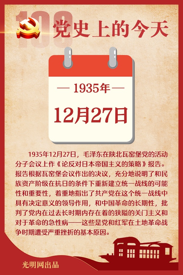 重要论述 1935年12月27日 毛泽东在陕北瓦窑堡党的活动分子会议上作《论反对日本帝国主义的策略》报告。报告根据瓦窑堡会议作出的决议,充分地说明了和民族资产阶级在抗日的条件下重新建立统一战线的可能性和重要性,着重地指出了共产党在这个统一战线中具有决定意义的领导作用,和中国革命的长期性,批判了党内在过去长时期内存在着的狭隘的关门主义和对于革命的急性病——这些是党和红军在土地革命战争时期遭受严重挫折的基本原因。报告还提醒全党注意大革命后期陈独秀右倾机会主义引导革命归于失败的历史教训。 关于目前形势的基本特点,报告指出:目前形势的基本特点,就是日本帝国主义要变中国为它的殖民地。这种情形,威胁到了全国人民的生存,给中国一切阶级和一切政治派别提出了“怎么办”的问题。中国工人阶级和农民阶级是中国革命最坚决的力量,他们都是要求反抗的。中国的小资产阶级也是要反抗的。大土豪、大劣绅、大军阀、大官僚、大买办们的主意早就打定了。他们组成了一个卖国贼营垒,他们的利益同帝国主义的利益是不可分离的,他们的总头子就是蒋介石。这一卖国贼营垒是中国人民的死敌。民族资产阶级是一个复杂的问题,但在今天的情况下,民族资产阶级是有发生变化的可能性的。民族资产阶级没有地主阶级那样多的封建性,没有买办阶级那样多的买办性。在殖民地化威胁的新环境之下,他们的特点是动摇,但在斗争的某些阶段,他们中间的一部分(左翼)是有参加斗争的可能的。其另一部分,则有由动摇而采取中立态度的可能。报告还指出:即使在地主买办阶级营垒中也不是完全统一的,这是半殖民地的环境,即许多帝国主义争夺中国的环境所造成的。由此,报告在革命统一战线策略方针上,提出了一个重要原则,就是“我们要把敌人营垒中间的一切争斗、缺口、矛盾,统统收集起来,作为反对当前主要敌人之用”。把以上这个阶级关系问题总起来说,就是:在日本帝国主义打进中国本部来了这一个基本的变化上面,变化了中国各阶级之间的相互关系,扩大了民族革命营垒的势力,减弱了民族反革命营垒的势力。报告回顾和分析了中国民族资产阶级在革命历史关头的种种表现,指出:国民党营垒中,在民族危机到了严重关头的时候,是要发生破裂的。这种情况,基本地说来是不利于反革命,而有利于革命的。报告还特别强调:目前是大变动的前夜。党的任务就是把红军的活动和全国的工人、农民、学生、小资产阶级、民族资产阶级的一切活动汇合起来,成为一个统一的民族革命战线。 关于民族统一战线,报告指出:党的基本的策略任务就是建立广泛的民族革命统一战线。当着革命的形势已经改变的时候,革命的策略,革命的领导方式,也必须跟着改变。目前的时局,要求我们勇敢地抛弃关门主义,采取广泛的统一战线。报告进一步阐明统一战线的策略同关门主义的策略之间的原则区别,指出:日本帝国主义决定要变全中国为它的殖民地,和中国革命的现时力量还有严重的弱点,这两个基本事实就是党的新策略即广泛的统一战线的出发点。组织千千万万的民众,调动浩浩荡荡的革命军,是今天的革命向反革命进攻的需要。因此,只有统一战线的策略才是马克思列宁主义的策略。关门主义的策略则是孤家寡人的策略。关门主义“为渊驱鱼,为丛驱雀”,把“千千万万”和“浩浩荡荡”都赶到敌人那一边去,只博得敌人的喝采。我们一定不要关门主义,我们要的是制日本帝国主义和汉奸卖国贼的死命的民族革命统一战线。报告还论述了中国共产党在抗日民族统一战线中的领导作用,指出:共产党和红军不但在现在充当着抗日民族统一战线的发起人,而且在将来的抗日政府和抗日军队中必然要成为坚强的台柱子。只要共产党和红军本身是存在的,发展的,那末,抗日民族统一战线必然也会是存在的,发展的。这就是共产党和红军在民族统一战线中的领导作用。共产党人现在已经不是小孩子了,他们能够善处自己,又能够善处同盟者。这篇报告收入《毛泽东选集》第一卷。 1936年12月27日 中共中央政治局召开会议,讨论西安事变和平解决后的工作。毛泽东作报告指出:我们过去估计西安事变带有革命性是对的,如果它没有革命性便不会有这样好的结果。西安事变给国民党以大的刺激,成为它转变的关键,逼着它结束十年的错误政策,结束十年内战,而内战的结束也就是抗战的开始。西安事变促进了国共合作,是划时代的转变,是新阶段的开始。蒋介石释放后,他的动摇是否最后结束?现在还只能说是结束的开始,我们要动员一切力量结束他的动摇。西安事变使蒋介石的地位降低了,而我们的地位提高了。我们在西安事变中实际地取得了领导地位,应利用这一有利形势开展全国局面,把红军扩大起来,与张、杨更加团结,成为抗日的核心,这是我们当前的任务。我们的具体策略是推动左派,争取中派,打击右派。 毛泽东作结论指出:巩固西北根据地,扩大红军和苏区,改造东北军和西北军。做好全国群众工作,把群众组织起来,这是工作的重心。加强对国民党的工作,特别要做好左派、中派和军队的工作,重视宣传工作,党报应办起来。培养干部,要办党校和红军学校,造就群众的、军事的、党的、政治的四种人才。应督促国民党三个月后召开救国会议。 2002