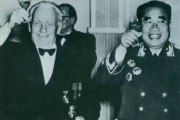 1956年1月4日,朱德率代表团出席了在柏林政府大厦举行的庆祝德意志民主共和国总统威廉·皮克80寿辰招待会。这是朱德向皮克总统祝酒。