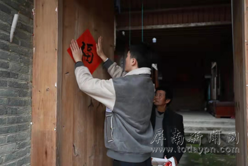 乡野艺校贴“福”。在前汾溪,乡野艺校的同学们带着村里的小朋友,推着板车到村民门口写春联,还给每家每户把春联贴上去。 红红的春联点燃了屏城的年味,浓浓的年味让群众红红火火过春节。 |
