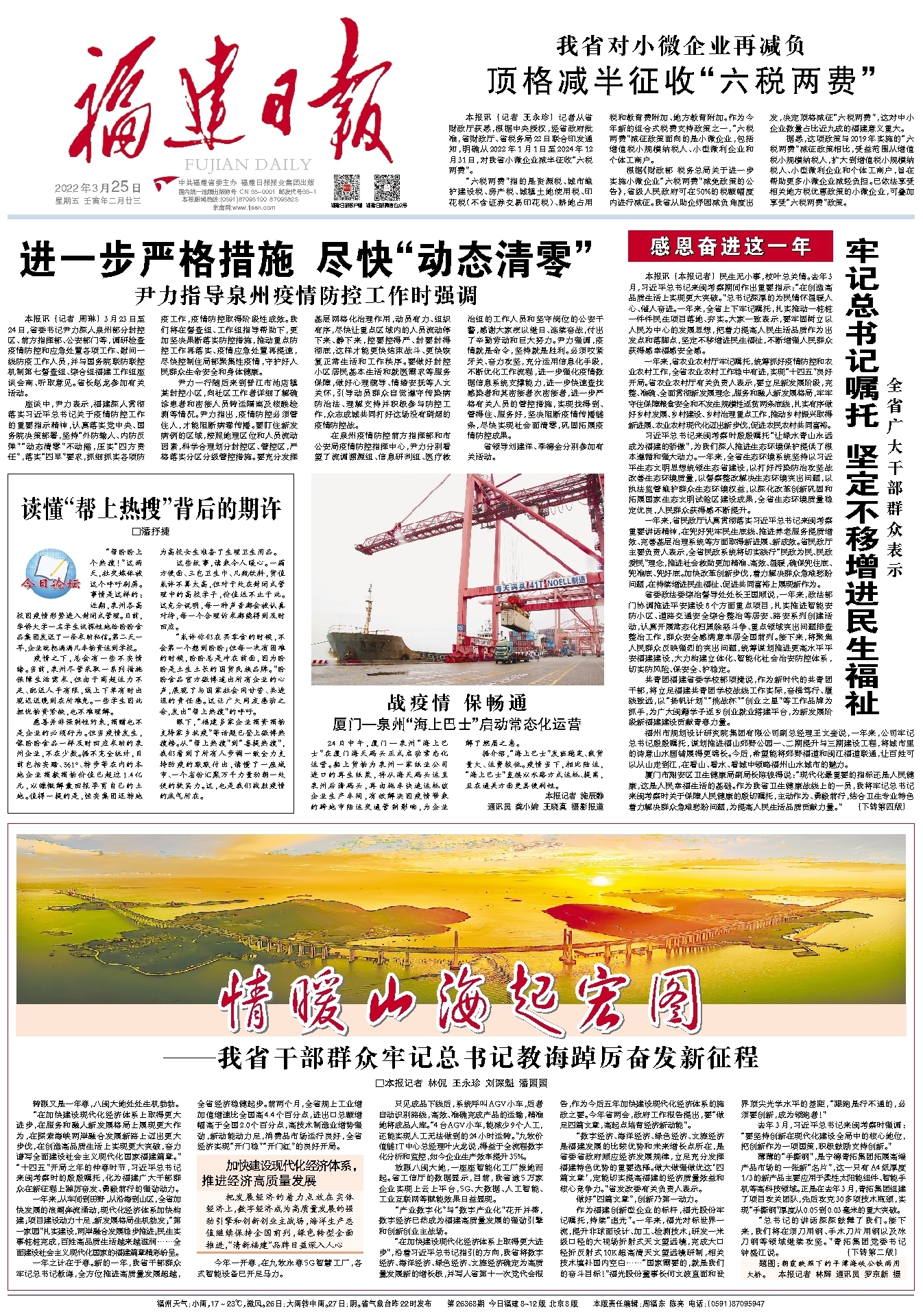 朝霞映照下的平潭海峡公铁两用大桥。本报记者 林辉 通讯员 罗京新 摄 转眼又是一年春,八闽大地处处生机勃勃。 “在加快建设现代化经济体系上取得更大进步,在服务和融入新发展格局上展现更大作为,在探索海峡两岸融合发展新路上迈出更大步伐,在创造高品质生活上实现更大突破,奋力谱写全面建设社会主义现代化国家福建篇章。”“十四五”开局之年的仲春时节,习近平总书记来闽考察时的殷殷嘱托,化为福建广大干部群众在新征程上踔厉奋发、勇毅前行的强劲动力。 一年来,从车间到田野,从沿海到山区,全省加快发展的浪潮奔流涌动,现代化经济体系加快构建;项目建设动力十足,新发展格局生机勃发;“第一家园”扎实建设,两岸融合发展稳步推进;民生实事桩桩完成,百姓高品质生活越来越滋润……全面建设社会主义现代化国家的福建篇章精彩纷呈。 一年之计在于春。新的一年,我省干部群众牢记总书记教诲,全方位推进高质量发展超越,全省经济稳健起步。前两个月,全省规上工业增加值增速比全国高4.4个百分点,进出口总额增幅高于全国2.0个百分点,高技术制造业增势强劲,新动能动力足,消费品市场运行良好,全省经济实现“开门稳”“开门红”的良好开局。 加快建设现代化经济体系,推进经济高质量发展 把发展经济的着力点放在实体经济上,数字经济成为高质量发展的强劲引擎和创新创业主战场,海洋生产总值继续保持全国前列,绿色转型全面推进,“清新福建”品牌日益深入人心 今年一开春,在九牧永春5G智慧工厂,各式智能设备已开足马力。 只见成品下线后,系统呼叫AGV小车,后者自动识别路线,高效、准确完成产品的运输,精准地将成品入库。“4台AGV小车,能减少9个人工,还能实现人工无法做到的24小时运转。”九牧价值链IT中心总经理叶火龙说,得益于全流程数字化分析和监控,如今企业生产效率提升35%。 放眼八闽大地,一座座智能化工厂拔地而起。省工信厅的数据显示,目前,我省逾5万家企业实现上云上平台,5G、大数据、人工智能、工业互联网等赋能效果日益显现。 “产业数字化”与“数字产业化”花开并蒂,数字经济已然成为福建高质量发展的强劲引擎和创新创业主战场。 “在加快建设现代化经济体系上取得更大进步”,沿着习近平总书记指引的方向,我省将数字经济、海洋经济、绿色经济、文旅经济确定为高质量发展新的增长极,并写入省第十一次党代会报告,作为今后五年加快建设现代化经济体系的施政之要。今年省两会,政府工作报告提出,要“做足四篇文章,高起点培育经济新动能”。 “数字经济、海洋经济、绿色经济、文旅经济是福建发展的比较优势和未来增长点所在,是省委省政府顺应经济发展规律,立足充分发挥福建特色优势的重要选择。做大做强做优这‘四篇文章’,定能切实提高福建的经济质量效益和核心竞争力。”省发改委有关负责人表示。 做好“四篇文章”,创新乃第一动力。 作为福建创新型企业的标杆,福光股份牢记嘱托,持续“追光”。一年来,福光对标世界一流,提升非球面设计、加工、检测技术;研发一米级口径的大视场折射式天文望远镜,完成大口径折反射式10K超高清天文望远镜研制,相关技术填补国内空白……“国家需要的,就是我们的奋斗目标!”福光股份董事长何文波直面和世界顶尖光学水平的差距,“跟跑是行不通的,必须要创新,成为领跑者!” 去年3月,习近平总书记来闽考察时强调:“要坚持创新在现代化建设全局中的核心地位,把创新作为一项国策,积极鼓励支持创新。” 薄薄的“手撕钢”,是宁德青拓集团拓展高端产品市场的一张新“名片”,这一只有A4纸厚度1/3的新产品主要应用于柔性太阳能组件、智能手机等高科技领域。正是在去年3月,青拓集团组建了项目攻关团队,先后攻克30多项技术瓶颈,实现“手撕钢”厚度从0.05到0.03毫米的重大突破。 “总书记的讲话深深鼓舞了我们。接下来,我们将在须刀用钢、手术刀片用钢以及冰刀钢等领域继续攻坚。”青拓集团党委书记钟盛江说。(下转第二版)(上接第一版) 企业纷纷“加速跑”,背后是创新创业创造环境的持续优化。 去年,我省为3707家企业发放研发投入分段补助14.9亿元,发放“科技贷”45.62亿元,还面向全国发布科技重大专项“揭榜挂帅”。 福建捷联电子公司提出的“大色域量子点背光显示器关键技术”攻关需求,由闽都创新实验室科研团队成功揭榜。“创新机制体现了‘创新不问出身’,对解决企业‘卡脖子’问题,以及新产品研发、新市场开拓大有好处。”闽都创新实验室副主任郭太良说。 一项项硬核举措,让创新进一步赋能福建实体经济高质量发展,也让“四篇文章”有了生动注脚—— 新大陆公司为“数字人民币”在北京冬奥会上大放异彩提供技术保障;美亚柏科、厦门科华等公司积极布局数据中心助力国家“东数西算”工程……2021年,福建数字经济增加值达2.3万亿元,同比增长15%,占GDP约47%。 今年2月,我国首台13兆瓦抗台风型海上风电机组在福清下线,创单机容量最大、叶轮直径最大两项亚洲之最;深远海智能养殖装备“闽投1号”正加紧建设,引领福建开启“海上牧场”建设新征程。2021年,全省海洋生产总值超1.1万亿元,继续保持全国前列。 发布第一代钠离子电池、布局电动船舶“新赛道”、做大储能产业链,动力电池领